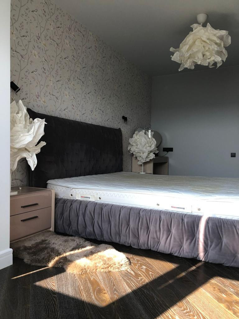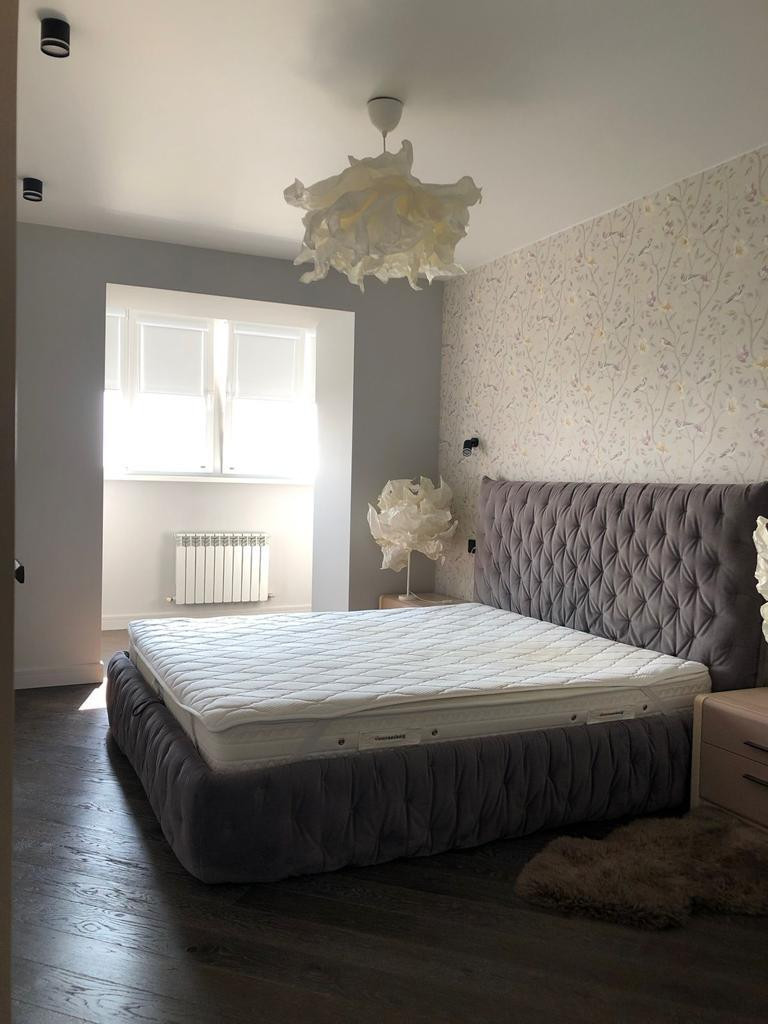 В главной спальне вид из окна на набережную реки Урал. Лес набережной реки Урал плавно распространяется по комнате в текстуре обоев с растительным орнаментом. Кровать фирмы Estetica c ортопедическим матрасом и подъемным механизмом с местом для хранения, высокого качества корпусная мебель Dyatkovo.