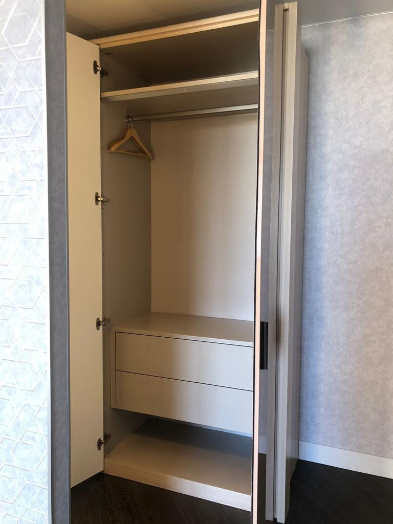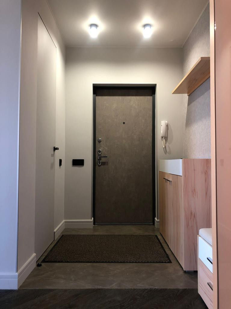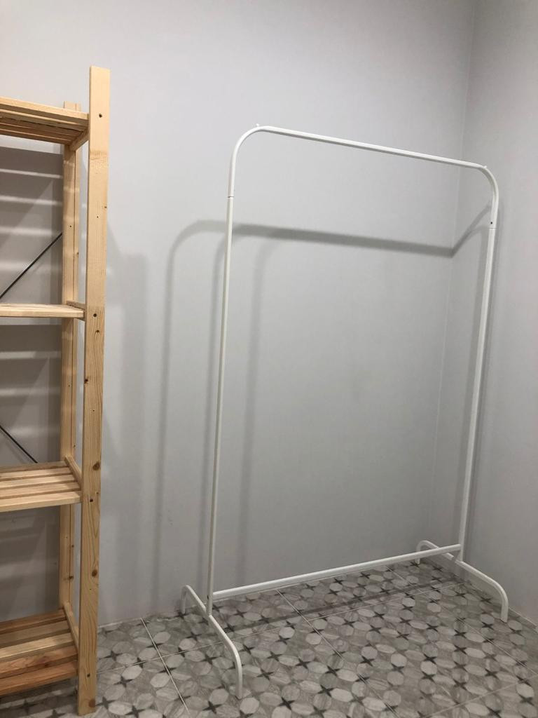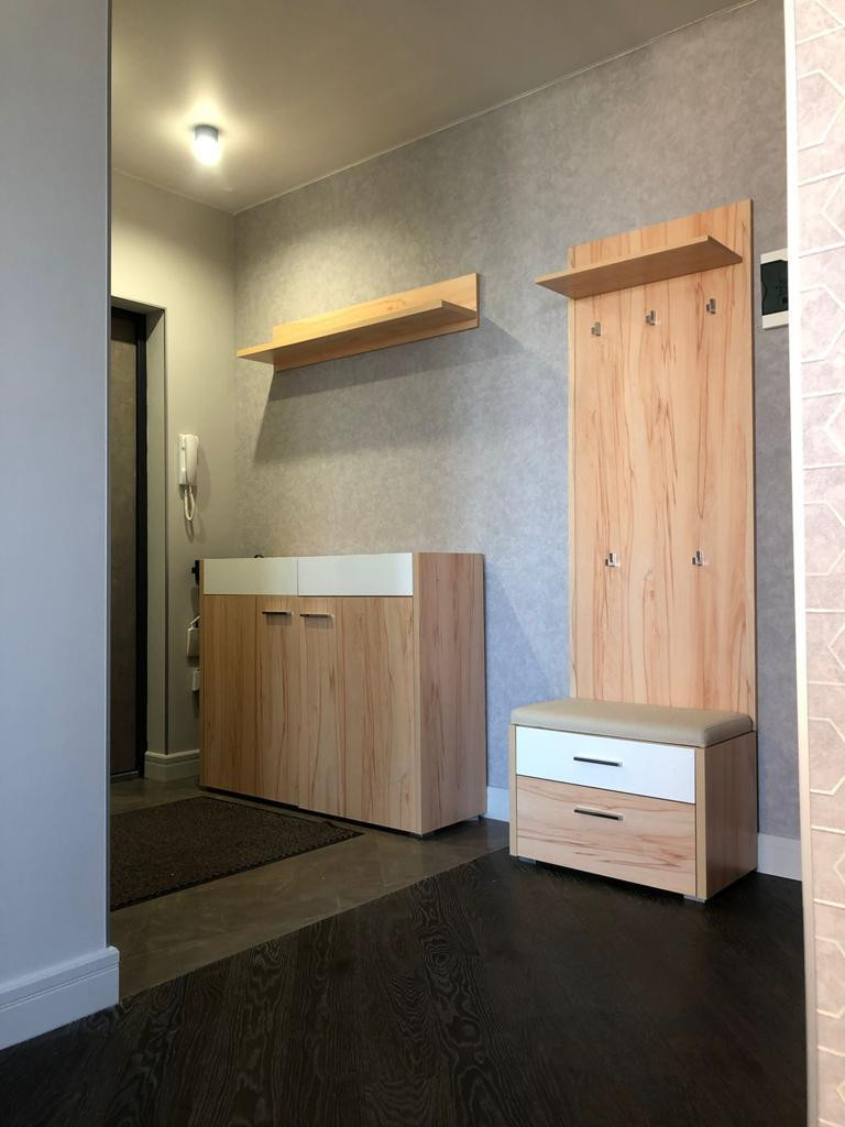 При входе есть гардеробная, где можно оставить инвентарь для занятий спортом и повесить одежду. А также вместительная обувница, пуф с ящиками для хранения принадлежностей для ухода за обувью и вешалка для вашей повседневной верхней одежды и сумок.