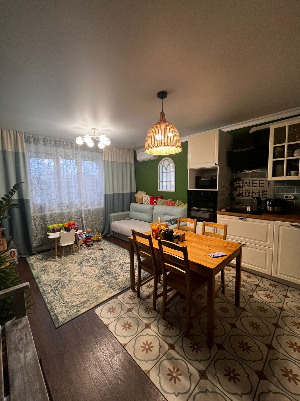 -пол-Арт винил,частично плитка в районе обеденной зоны;