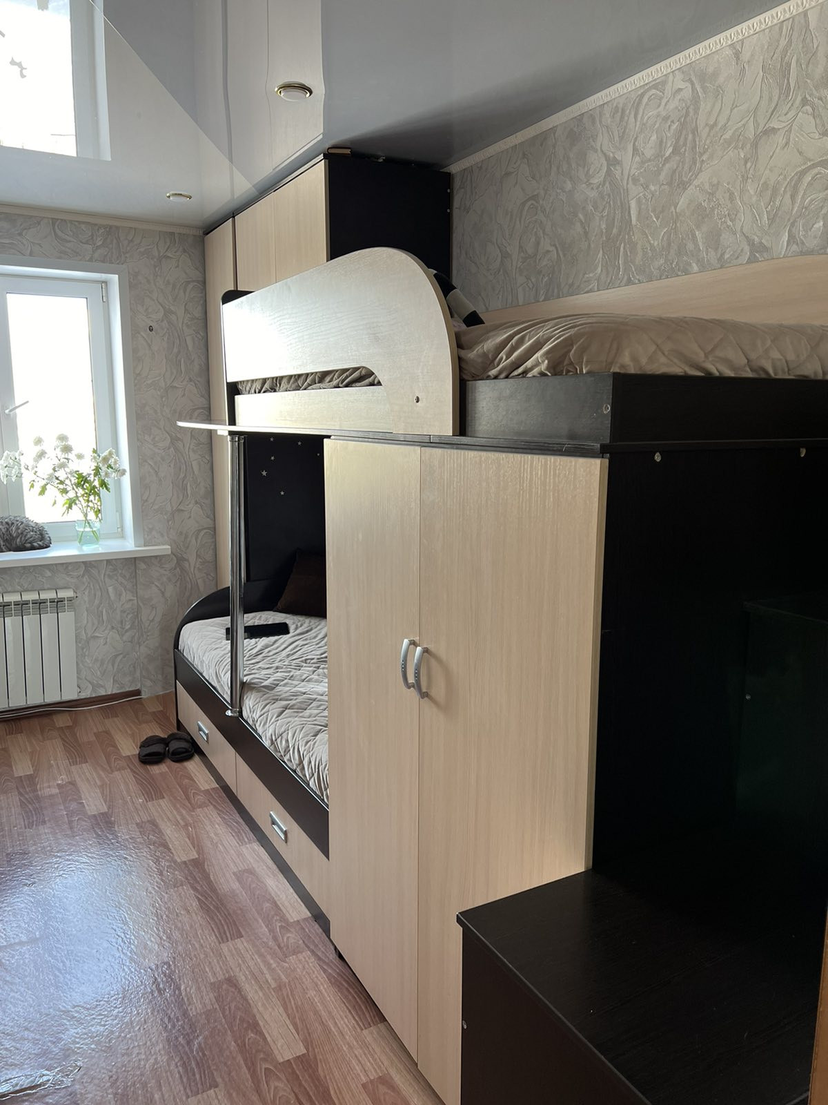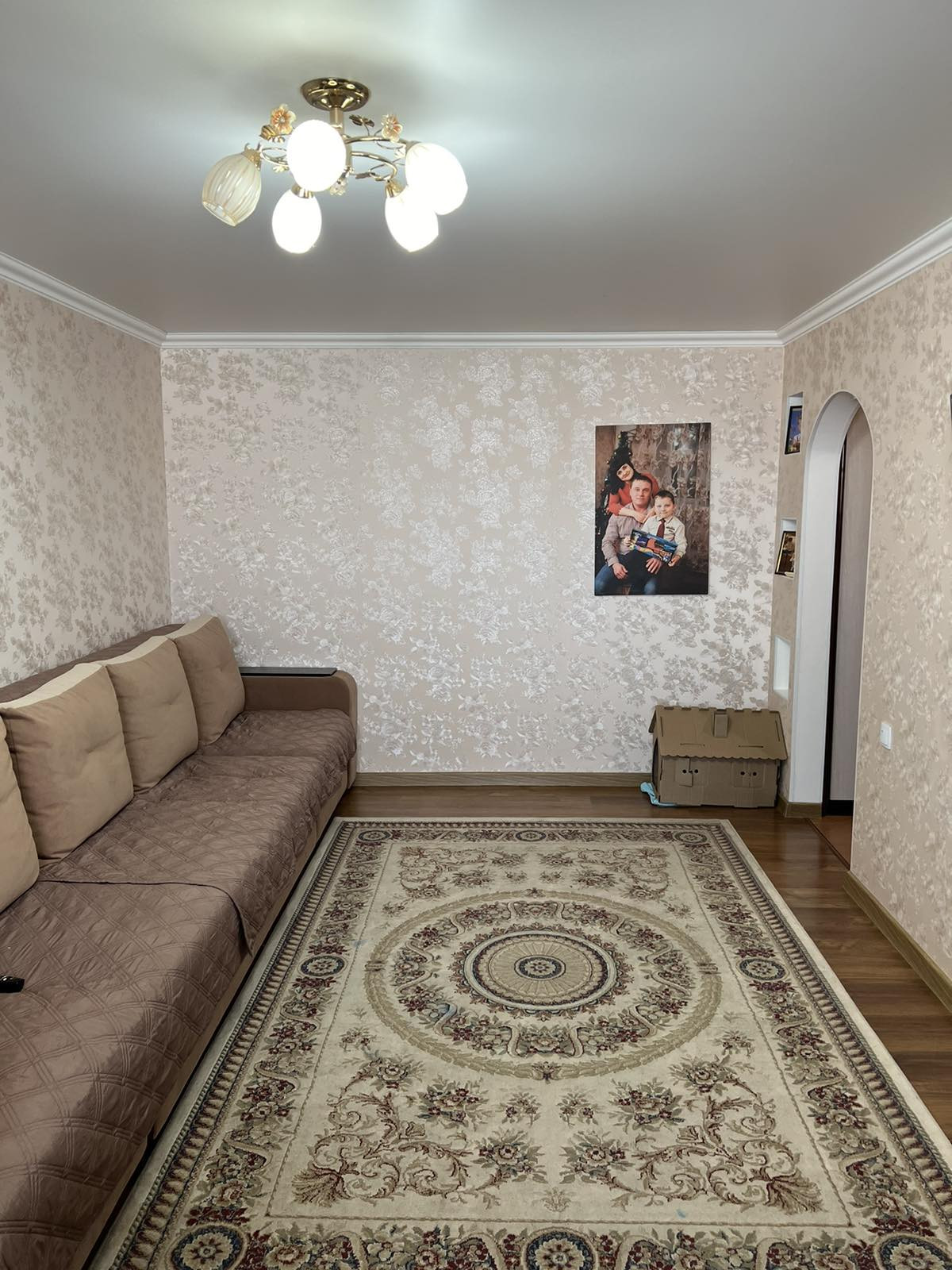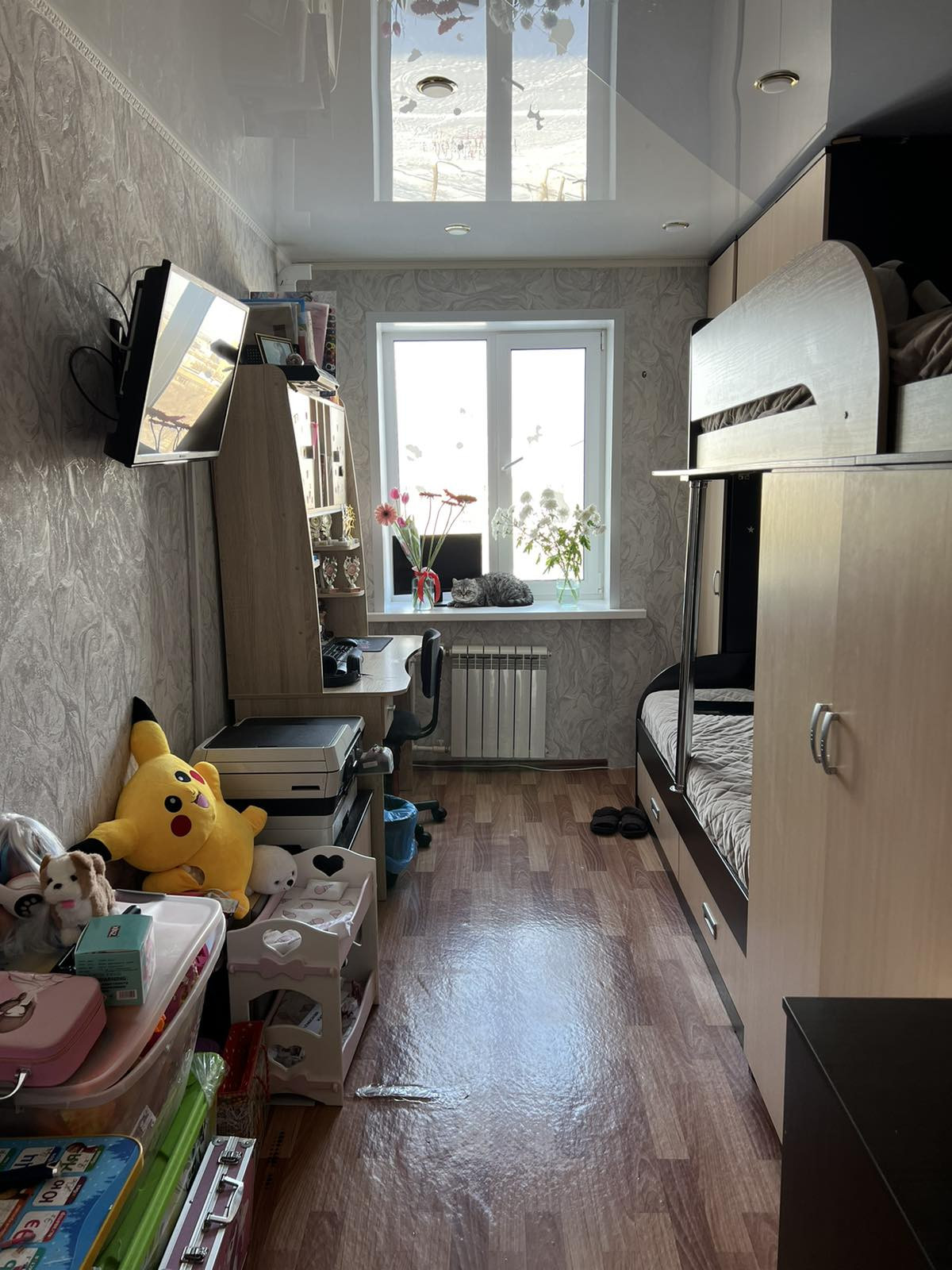 - Потолки отшпаклеваны и покрашены на кухне в зале, спальне, в прихожей натяжные.