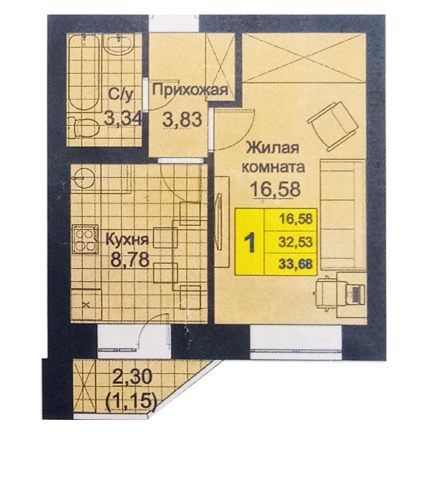 Общая площадь 34 м2