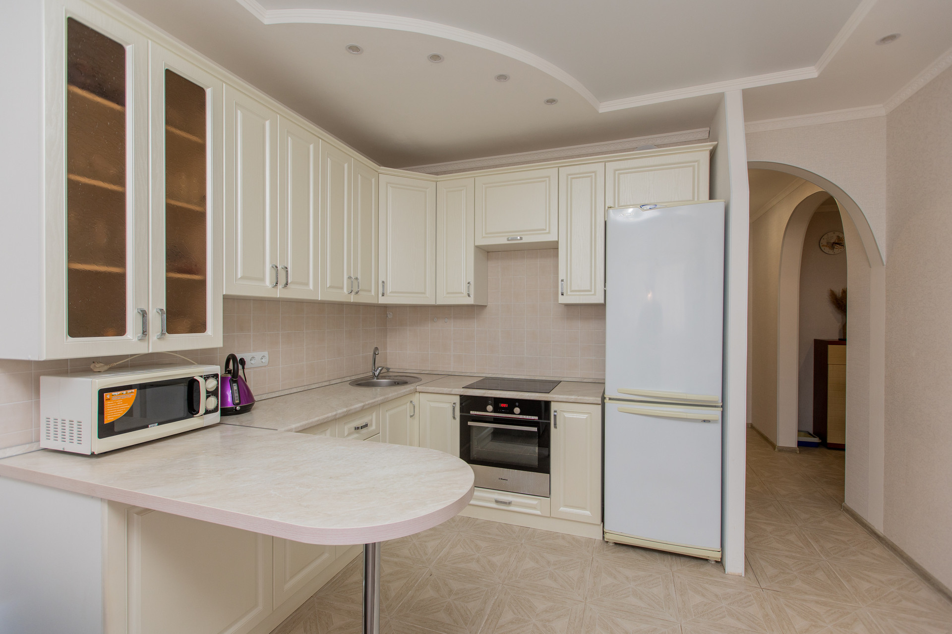 Квартира с качественным ремонтом, выполненным в теплой световой гамме. Стены и полы идеально выровнены, потолки двухуровневые с подсветкой. Напольное покрытие: в комнатах - ламинат, в санузле, прихожей - кафель, на кухне кафель комбинирован с ламинатом.