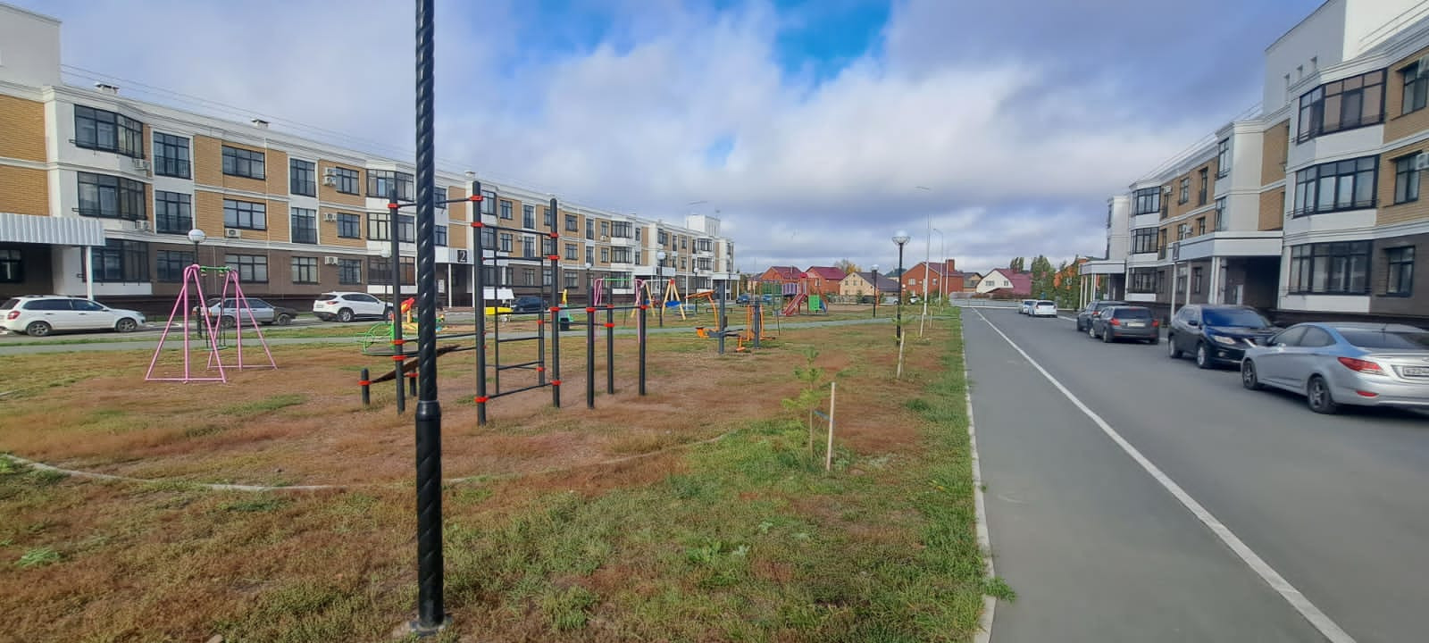 Во дворе детская площадка, много места для парковки, спокойная не шумная улица.
