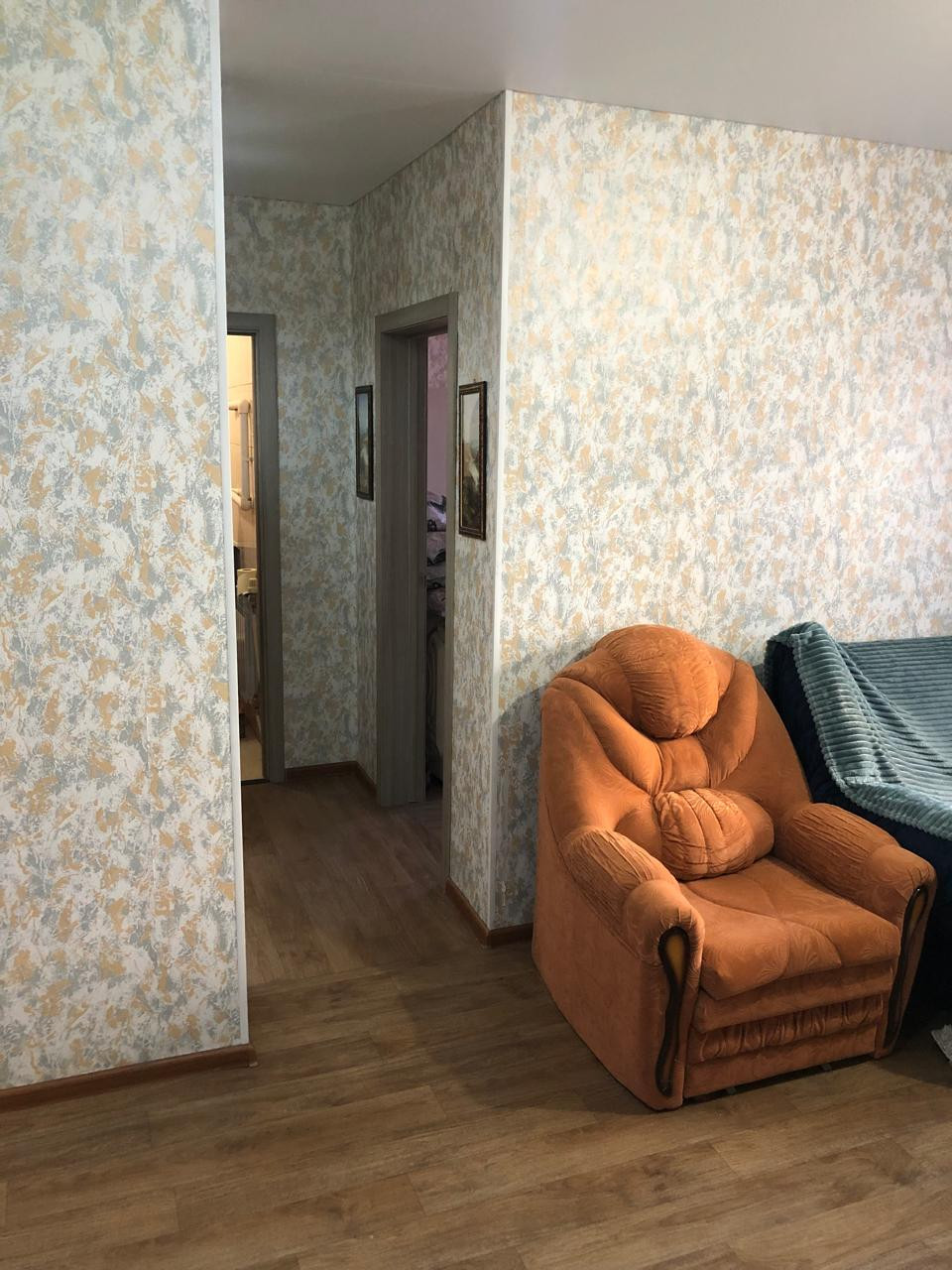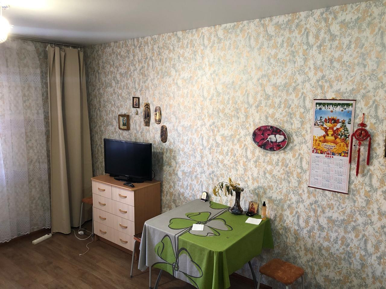 Стены выровнены, наклеяны обои. На полу линолеум. Выведены дополнительные розетки,