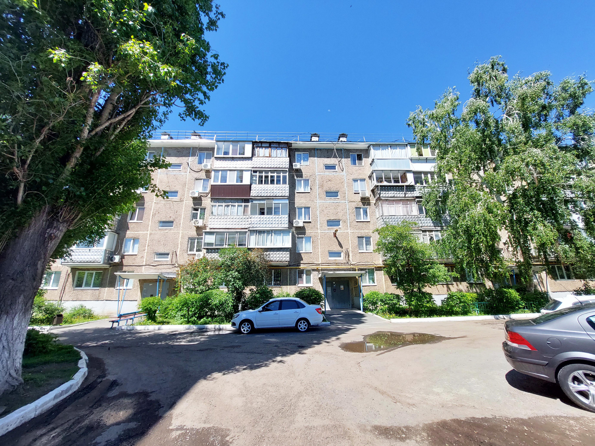 Спокойный тихий двор, много зелени. Есть детская площадка и место для парковки автомобиля. Хорошая транспортная развязка - можно выехать в сторону Степного, центра города, восточной части и на объездную.