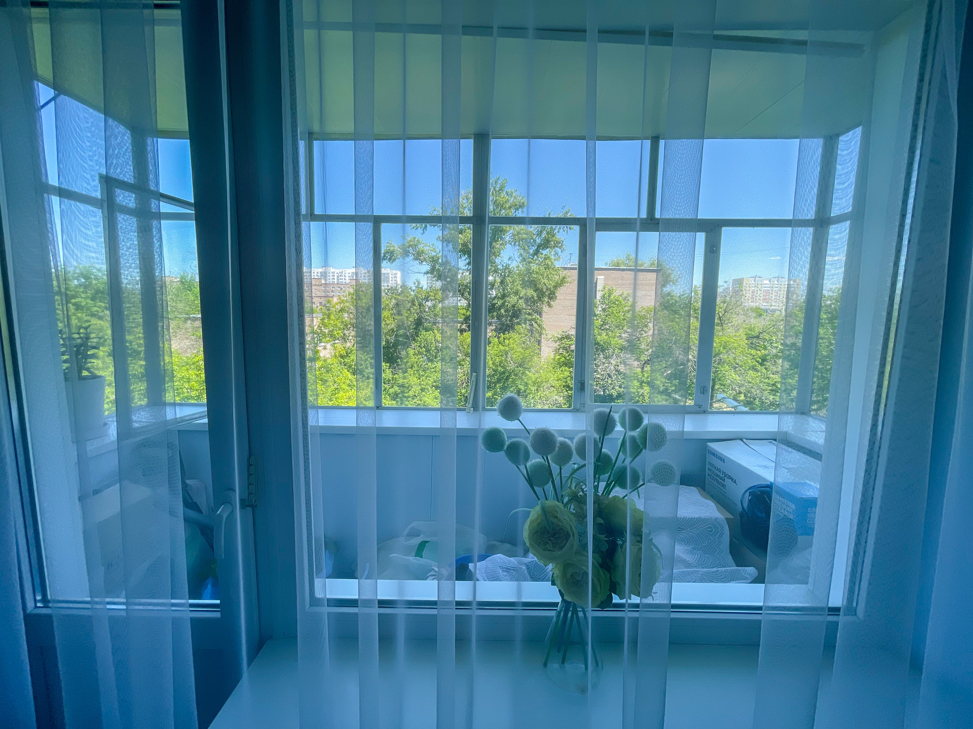 Имеется застекленный балкон, отделанный пластиком.