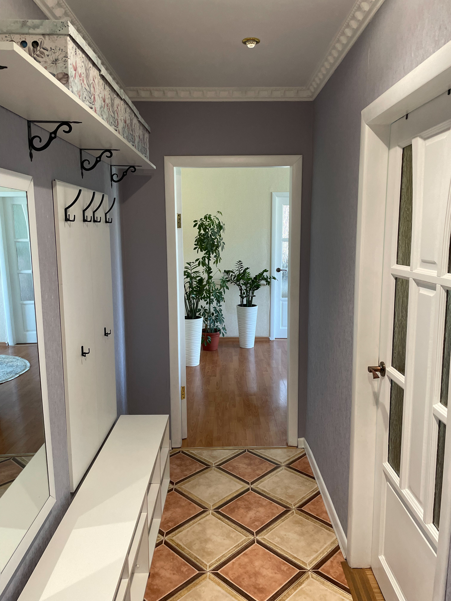 СУР (кафель), металлическая входная дверь, пластиковые окна и водопровод, на полу ламинат и керамогранит.