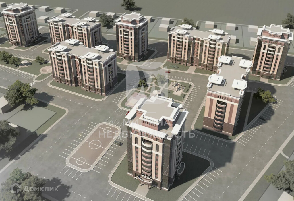 Благоустроенная территория с озеленением, парковками, детской игровой площадкой, зоной отдыха и спортивной площадкой.