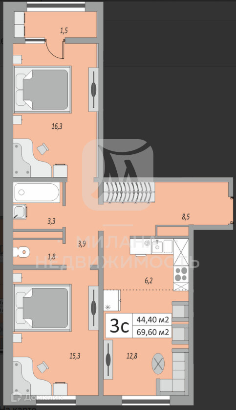 Общая площадь квартиры составляет 69,60 кв. м, кухня - 6,2кв. м, переходящая в гостинную 12,8 кв.м, жилые комнаты - 15,3 кв. м. и 16,3 кв.м.