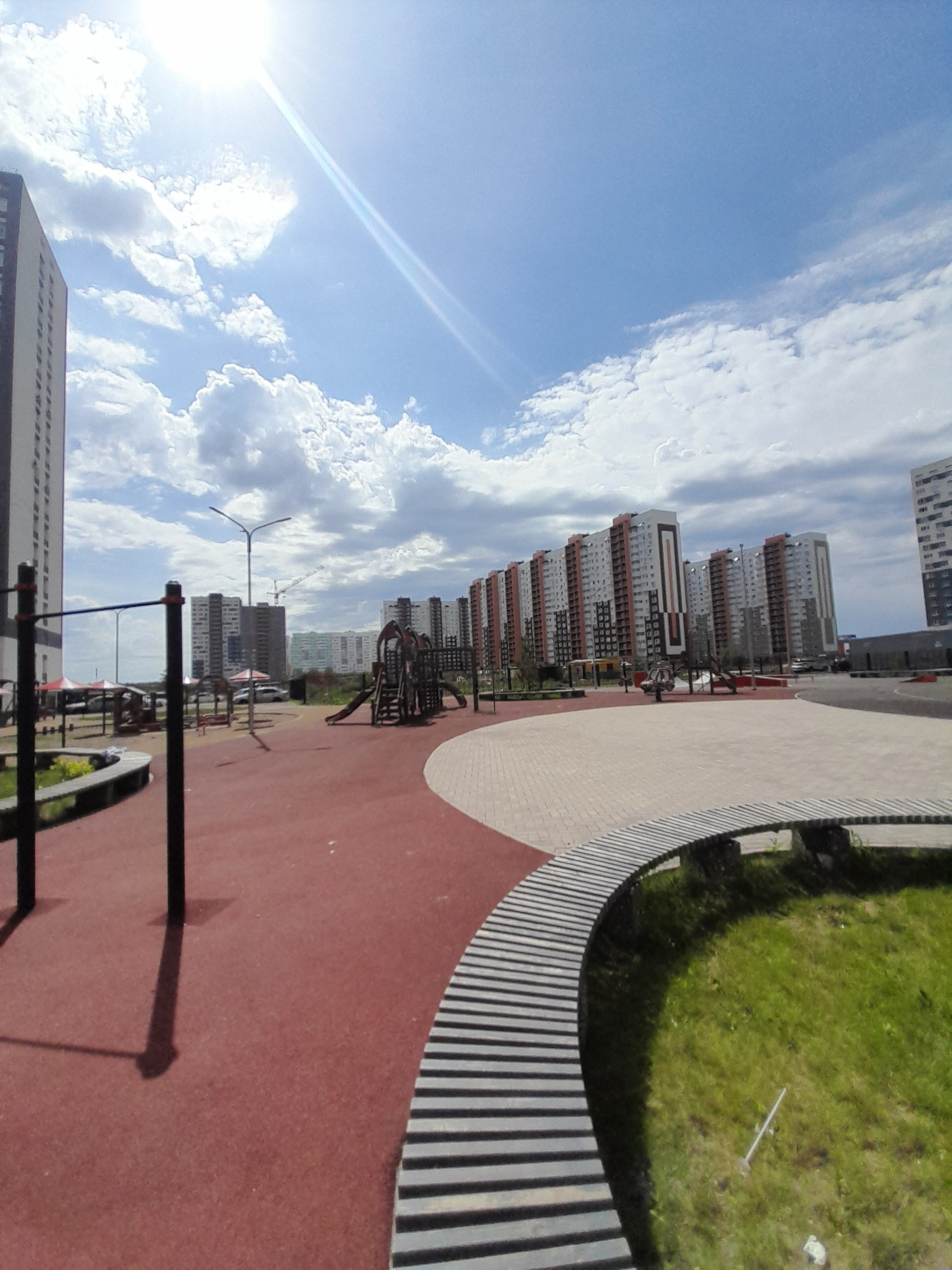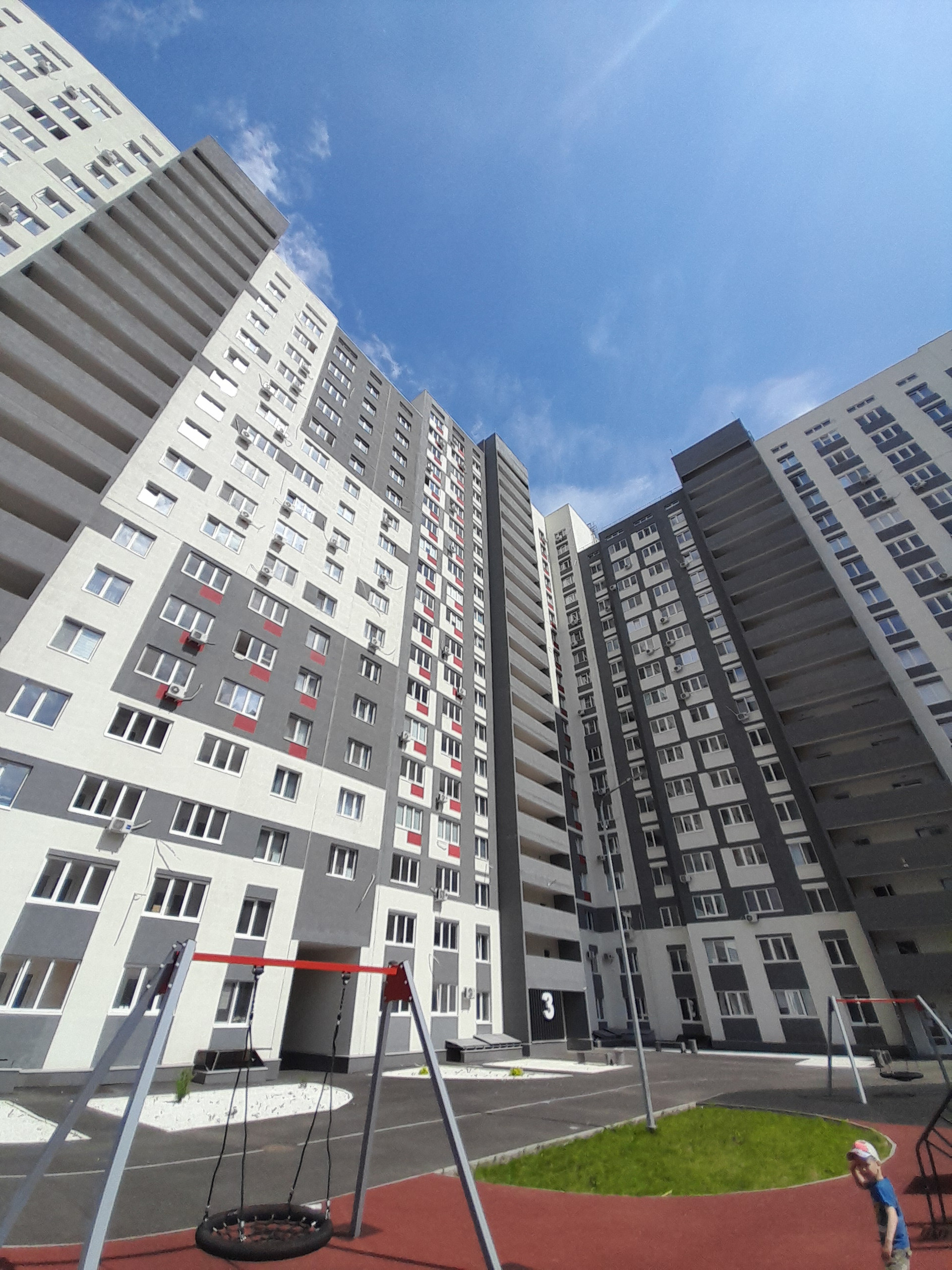 Во дворе закрытая территория - без машин. Современная детская площадка.