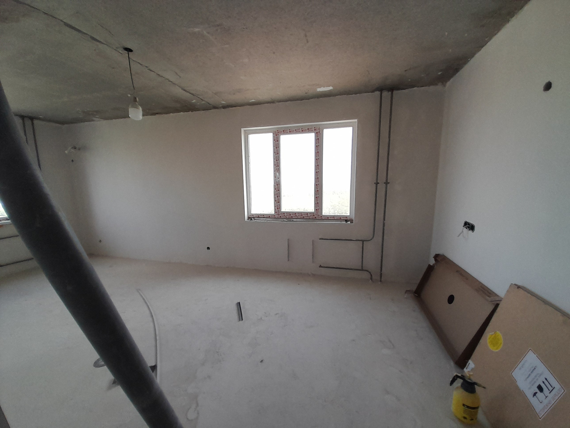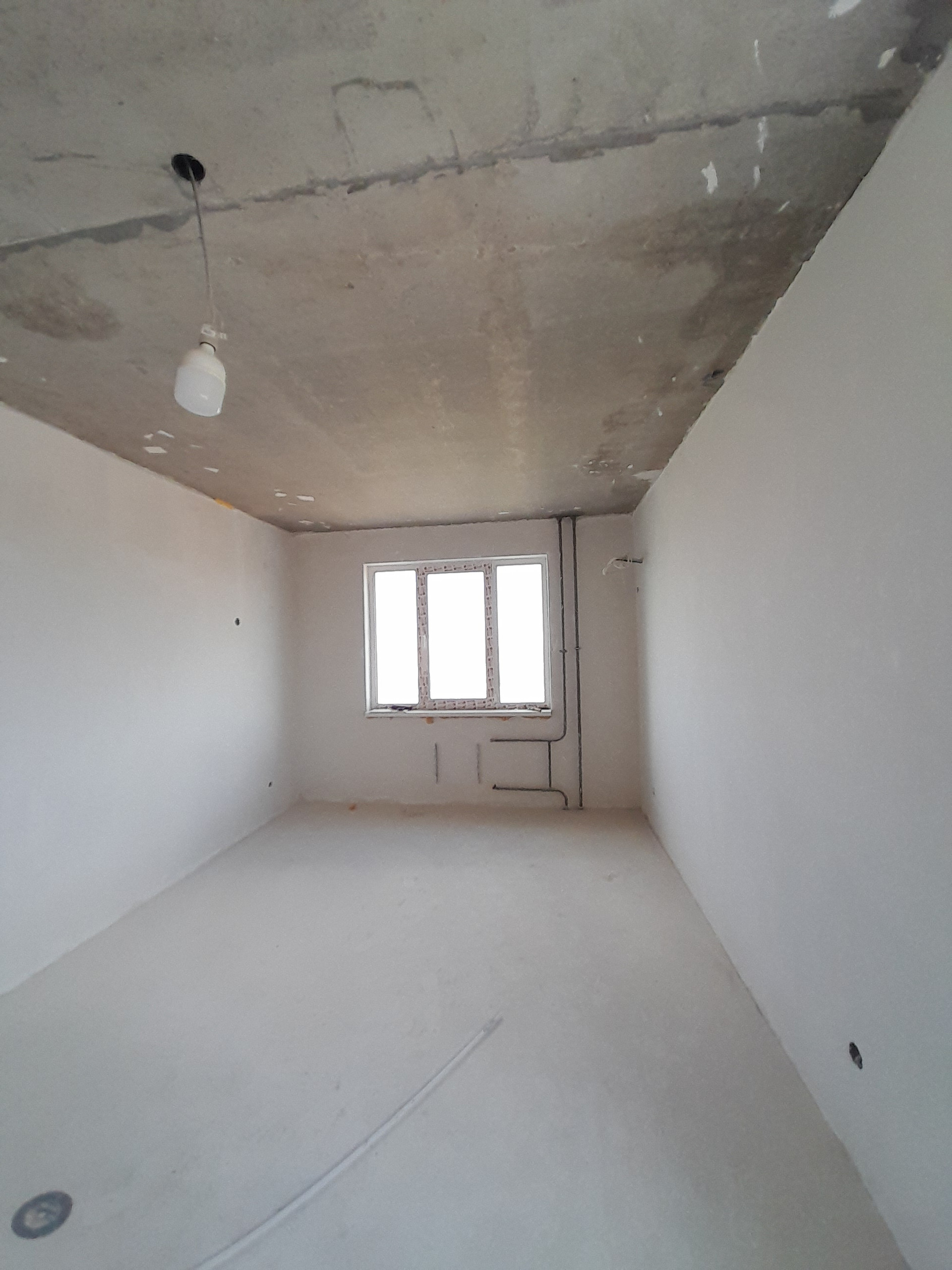 Ровные полы, стены выравнены и отштукатурены.