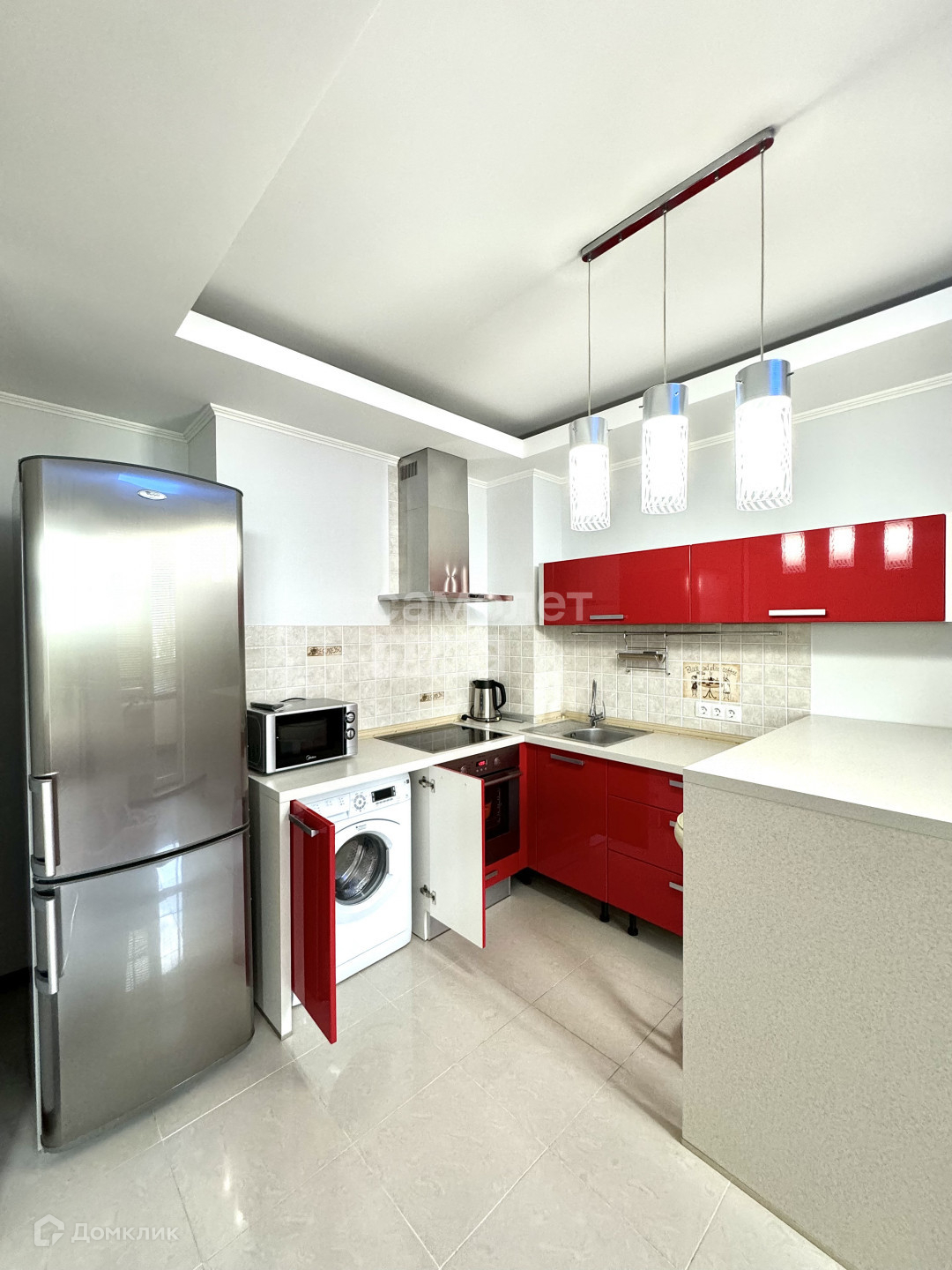 Квартира полностью укомплектована, остаётся кухонный гарнитур со встроенной техникой (духовой шкаф,плита), холодильник, микроволновая печь, кондиционер, стиральная машина, телевизор, диван.
