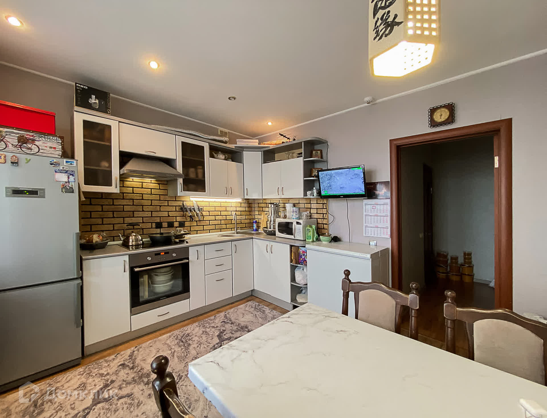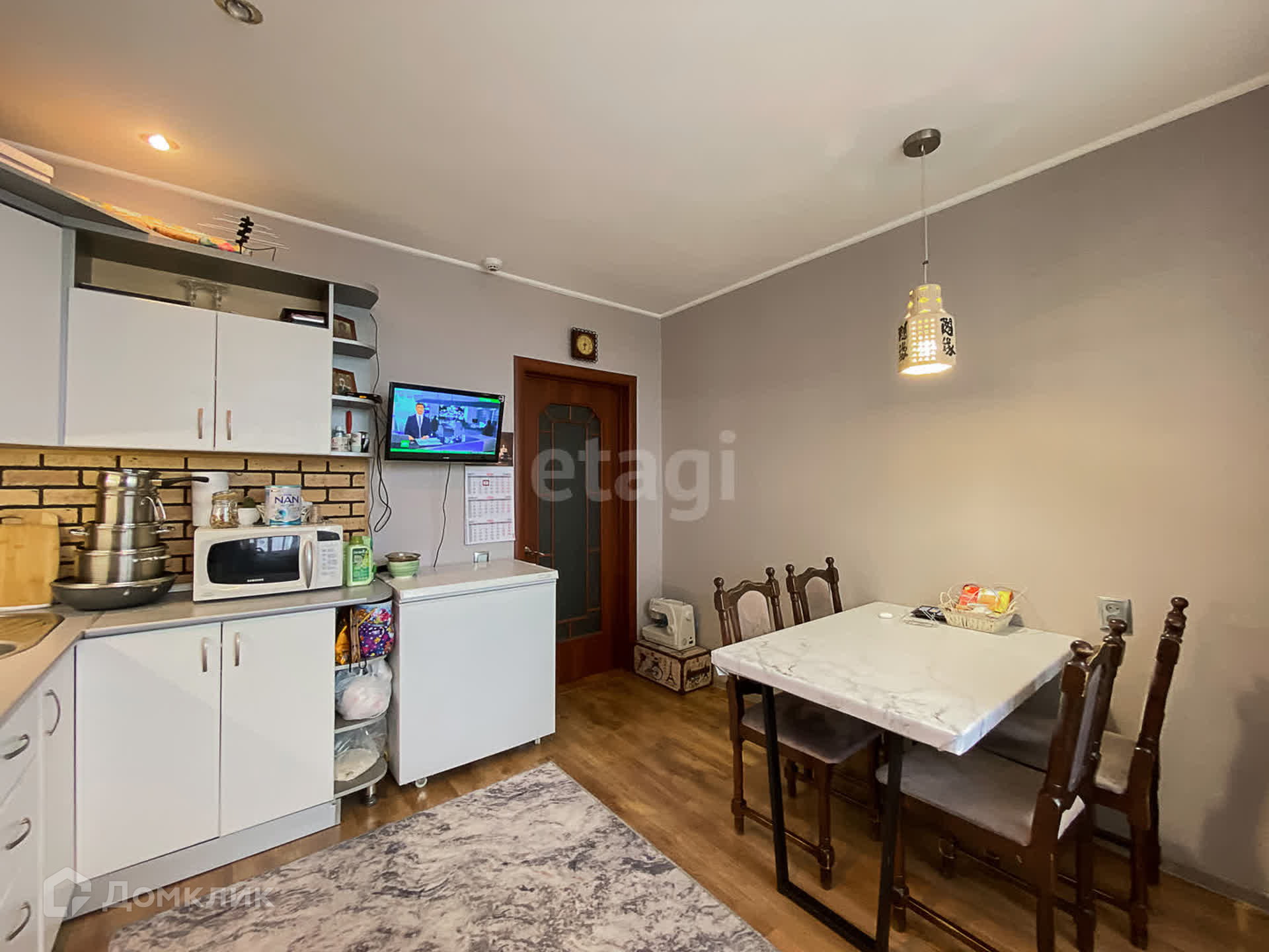 В квартире остается: кухонный гарнитур, варочная поверхность, духовой шкаф, вытяжка, сплит-система, кухонный стол и стулья, шкаф.