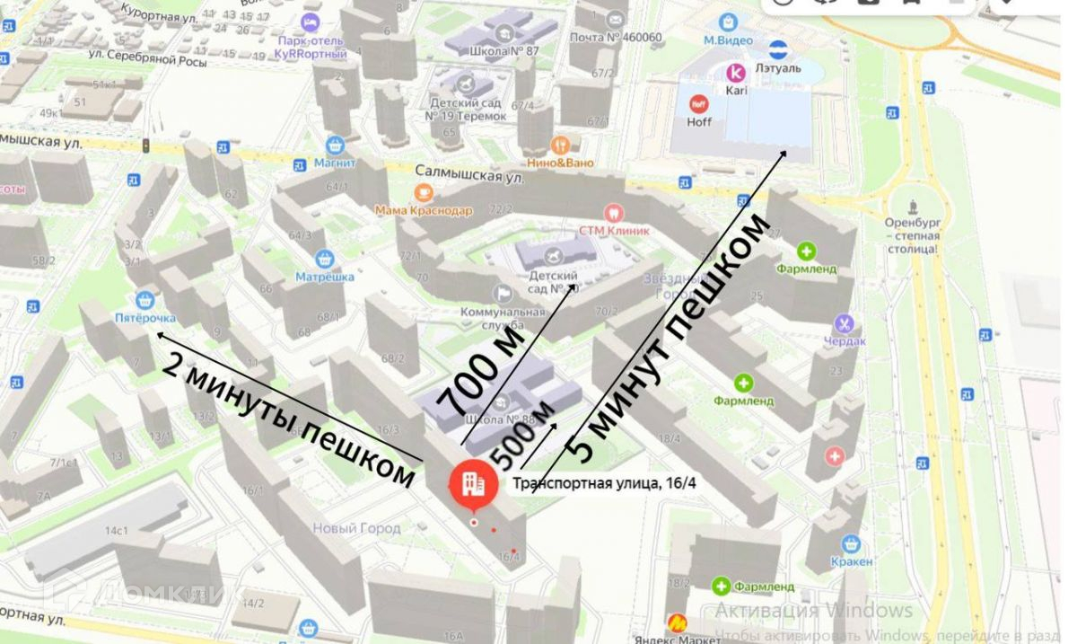 В пешей доступности тц "Кит", "Фермер базар". Так же в 5 минутах езды тц "Новый мир", Город еды.