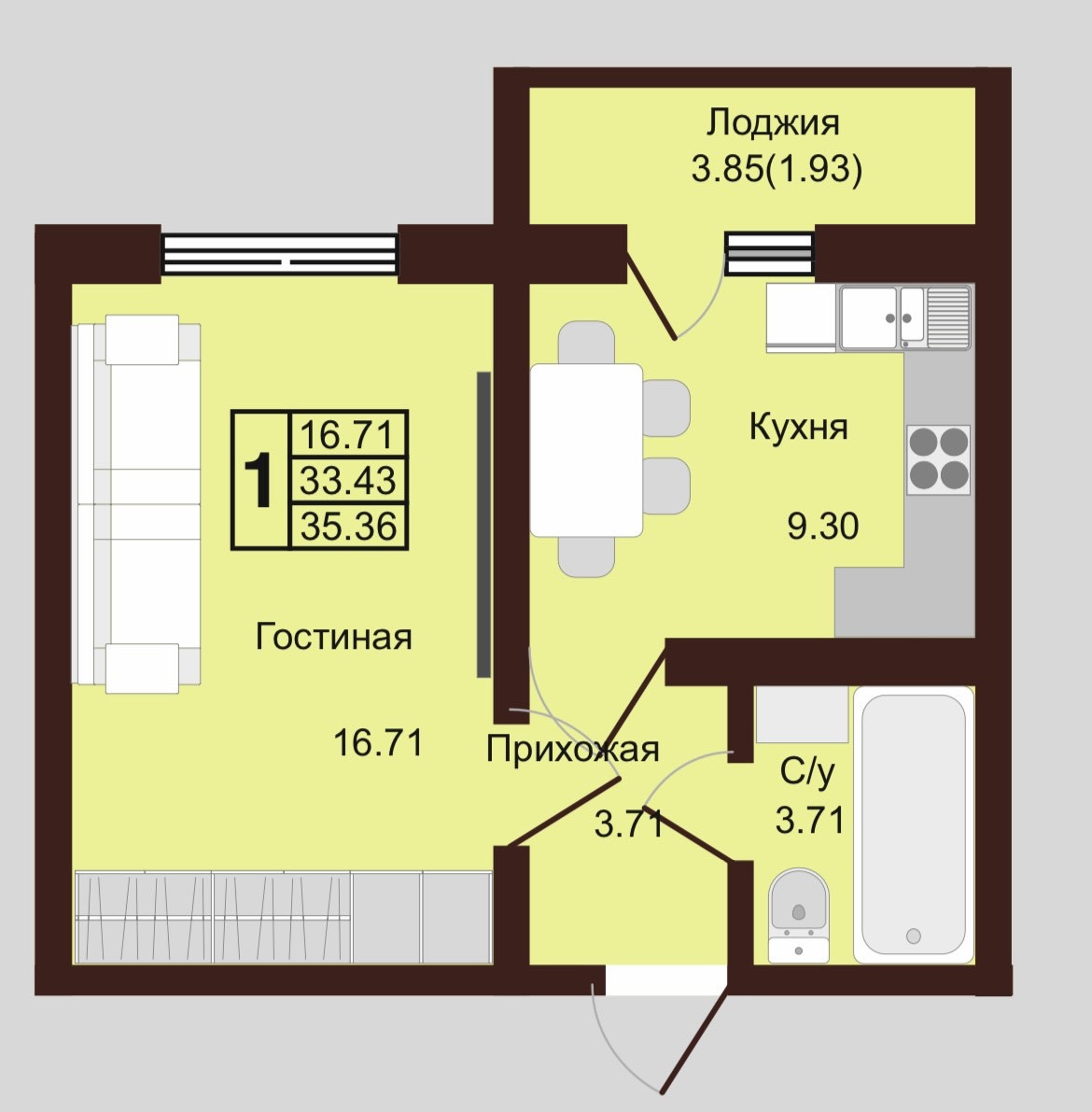 - изолированная кухня 9.3 кв.м. с выходом на лоджию 3.85 кв.м.