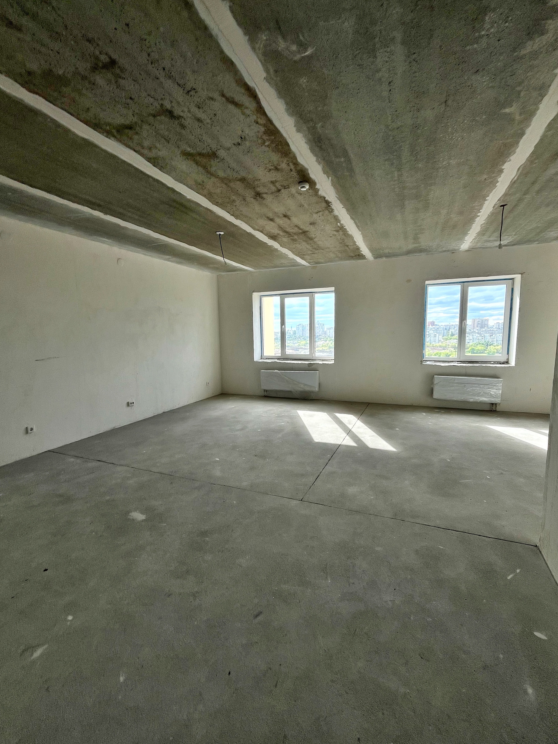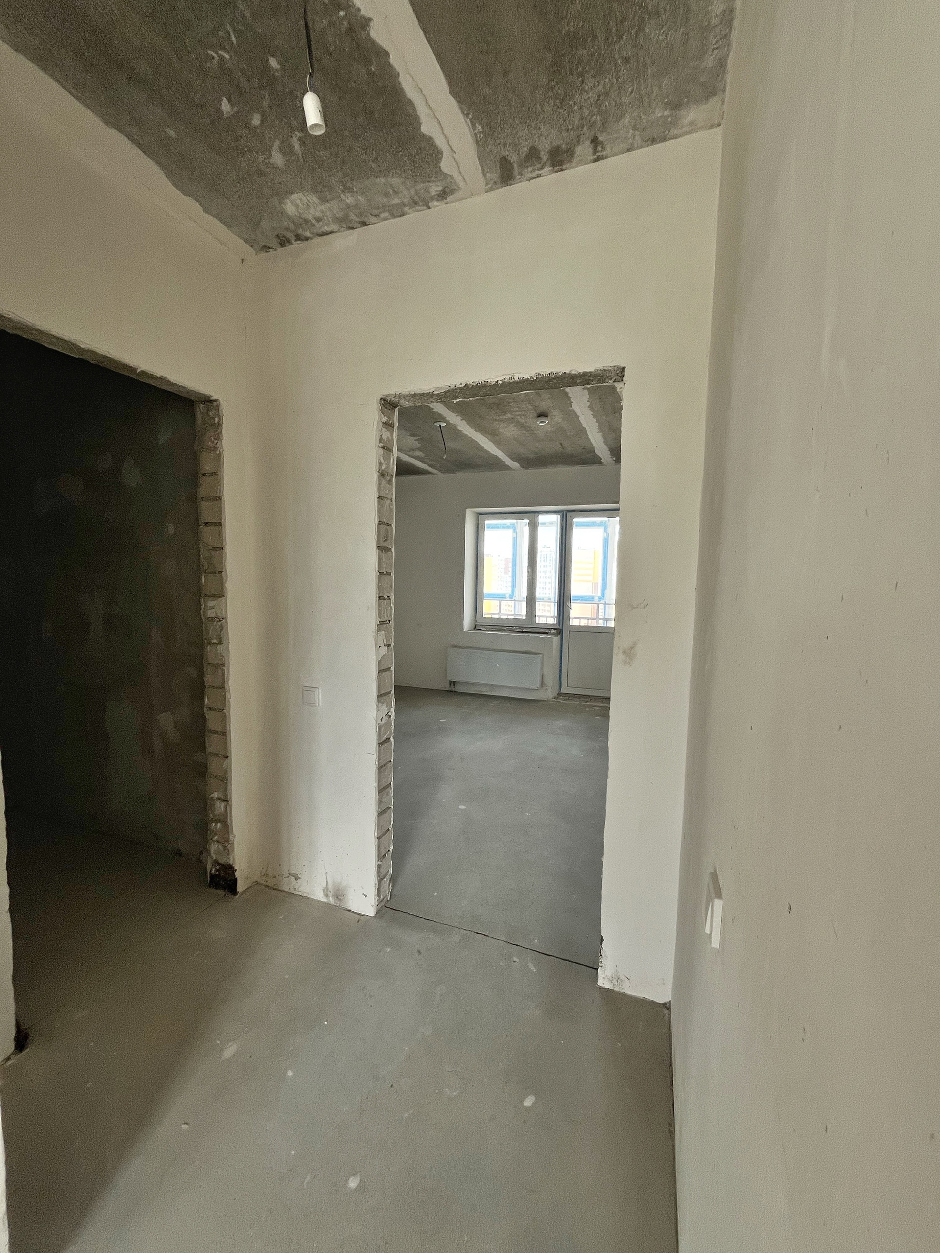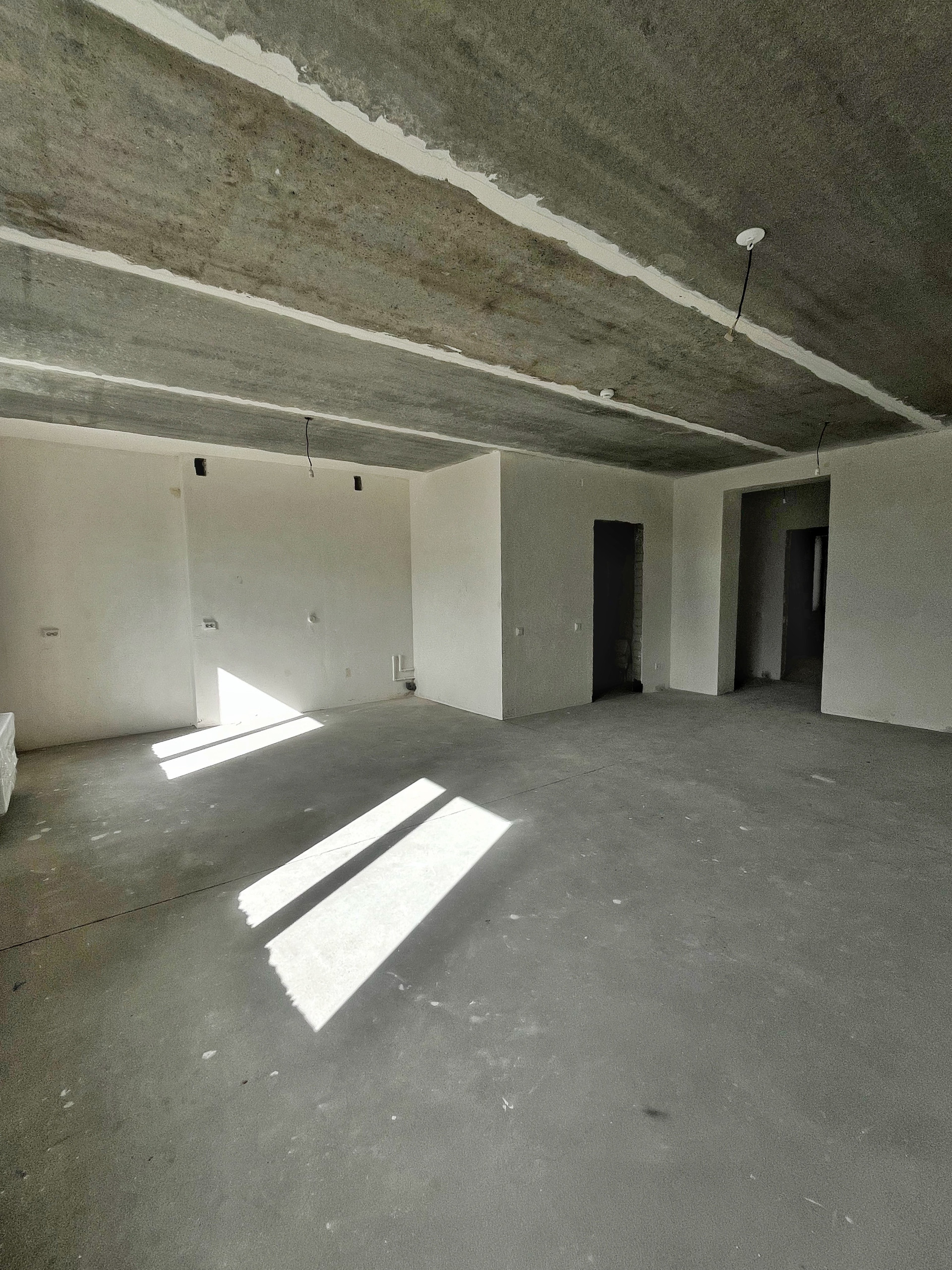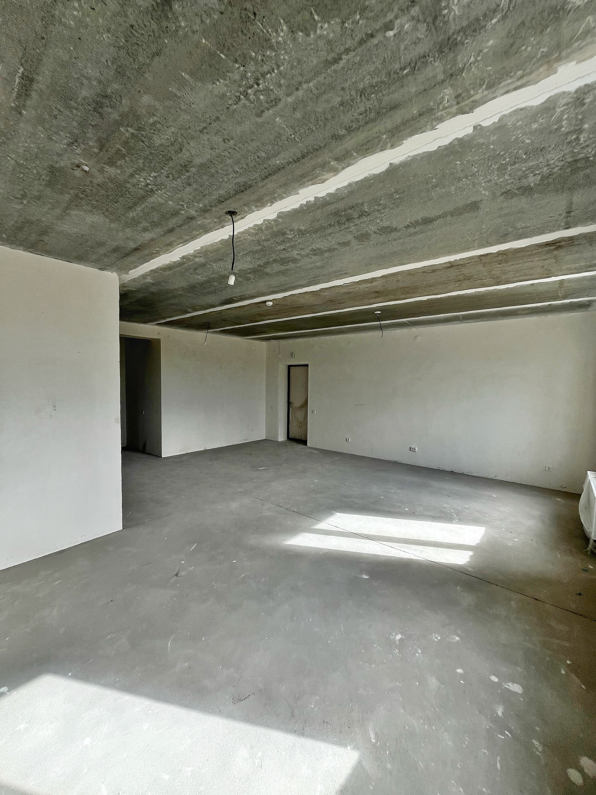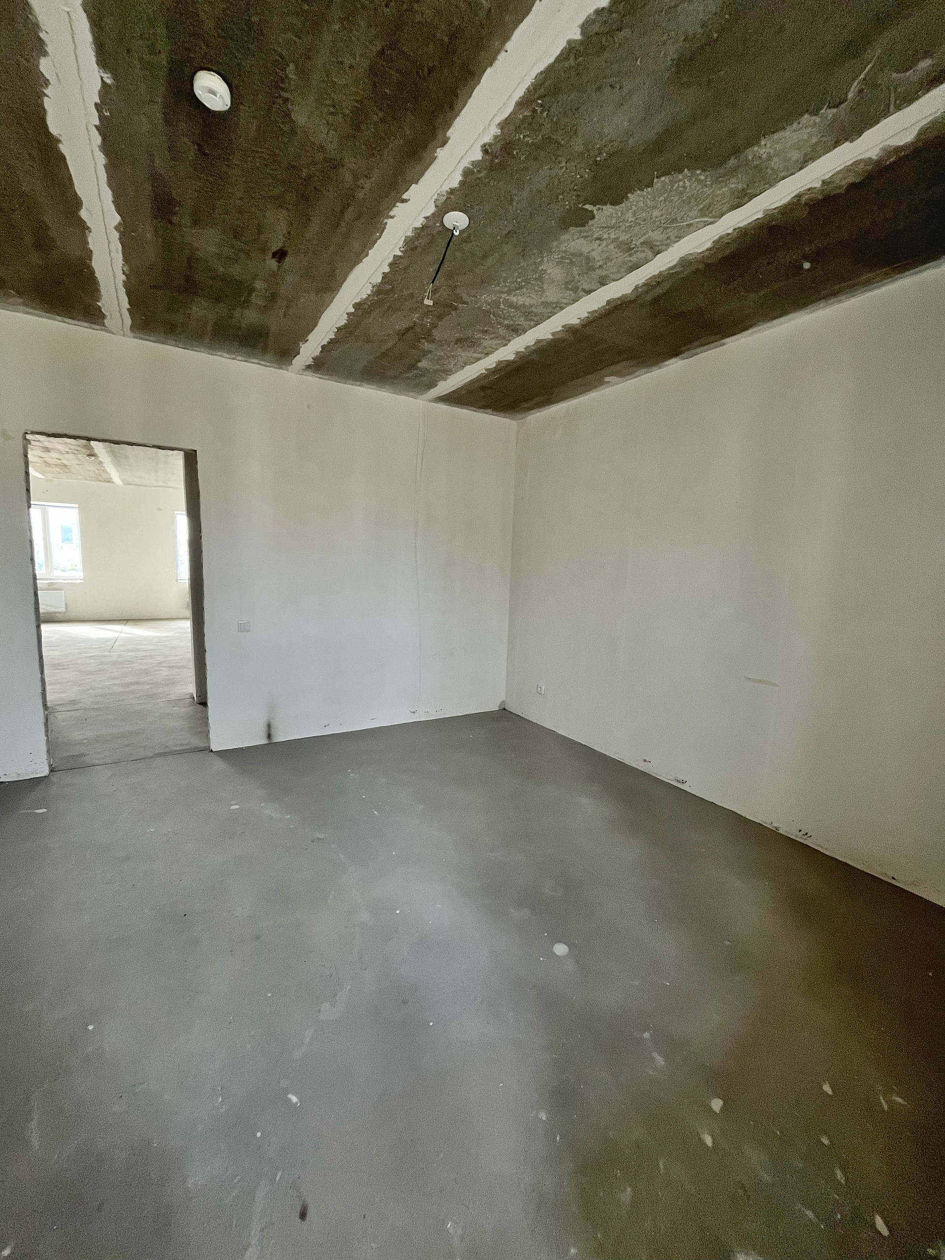 Квартира с улучшенной предчистовой отделкой: на полу полусухая стяжка, белые оштукатуренные стены, разводка по электрике.