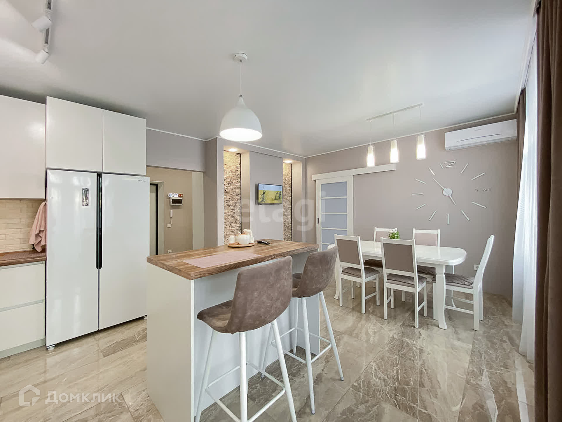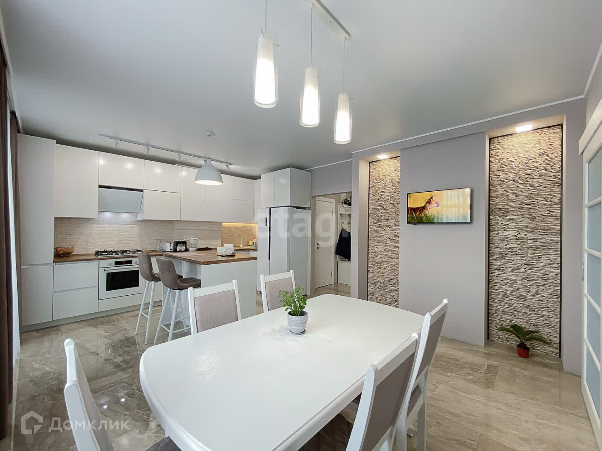 Будущим владельцам остается кухонный гарнитур, изготовленный по индивидуальному заказу, и вся встроенная техника, включая двухдверный холодильник.