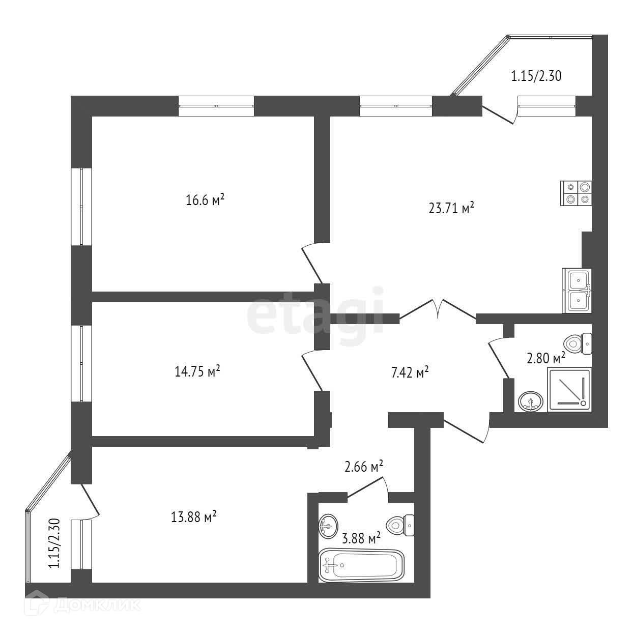 Одним из основных преимуществ данной квартиры является ее планировка: комнаты правильной формы и просторная кухня-гостиная площадью 23,71 квадратных метра.