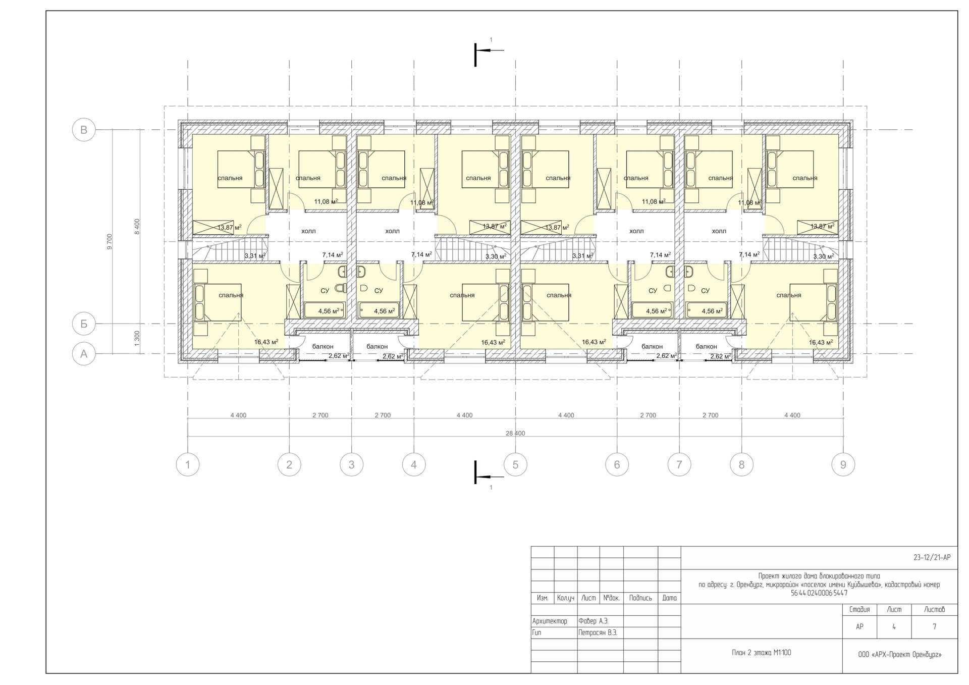 На втором этаже: 3 спальни 16,43 кв.м., 13,87 кв.м., 11,08 кв.м., большой санузел.