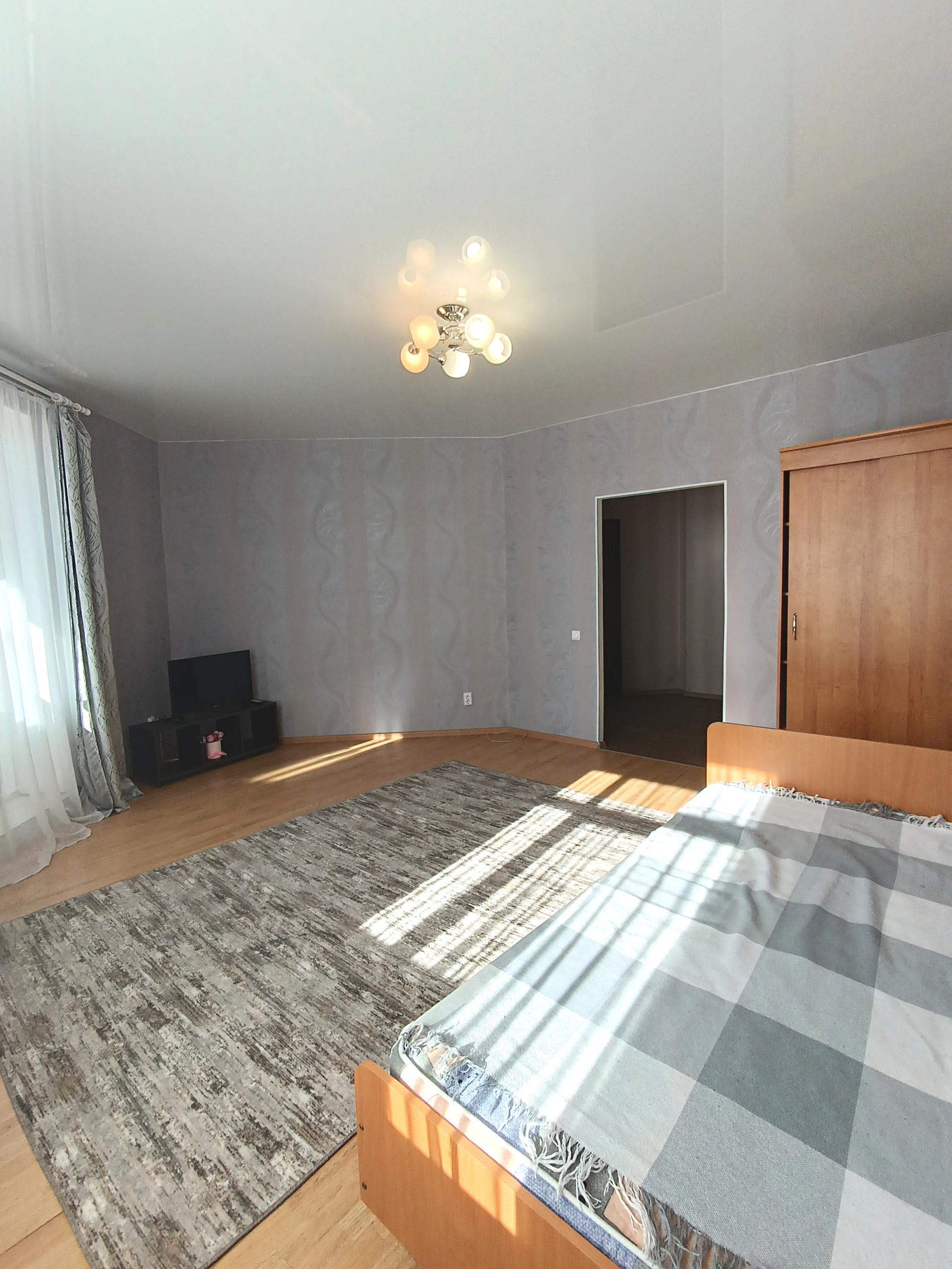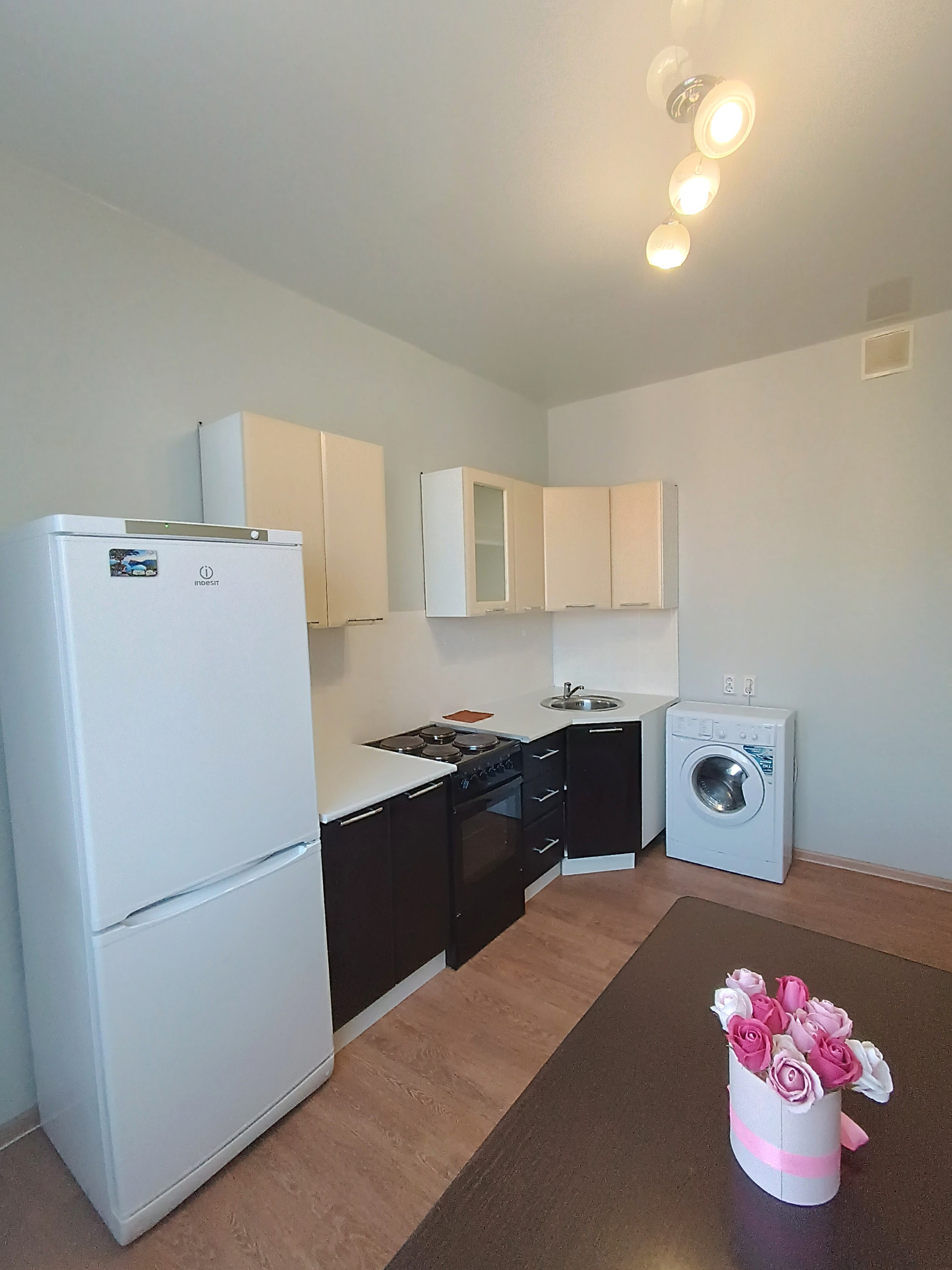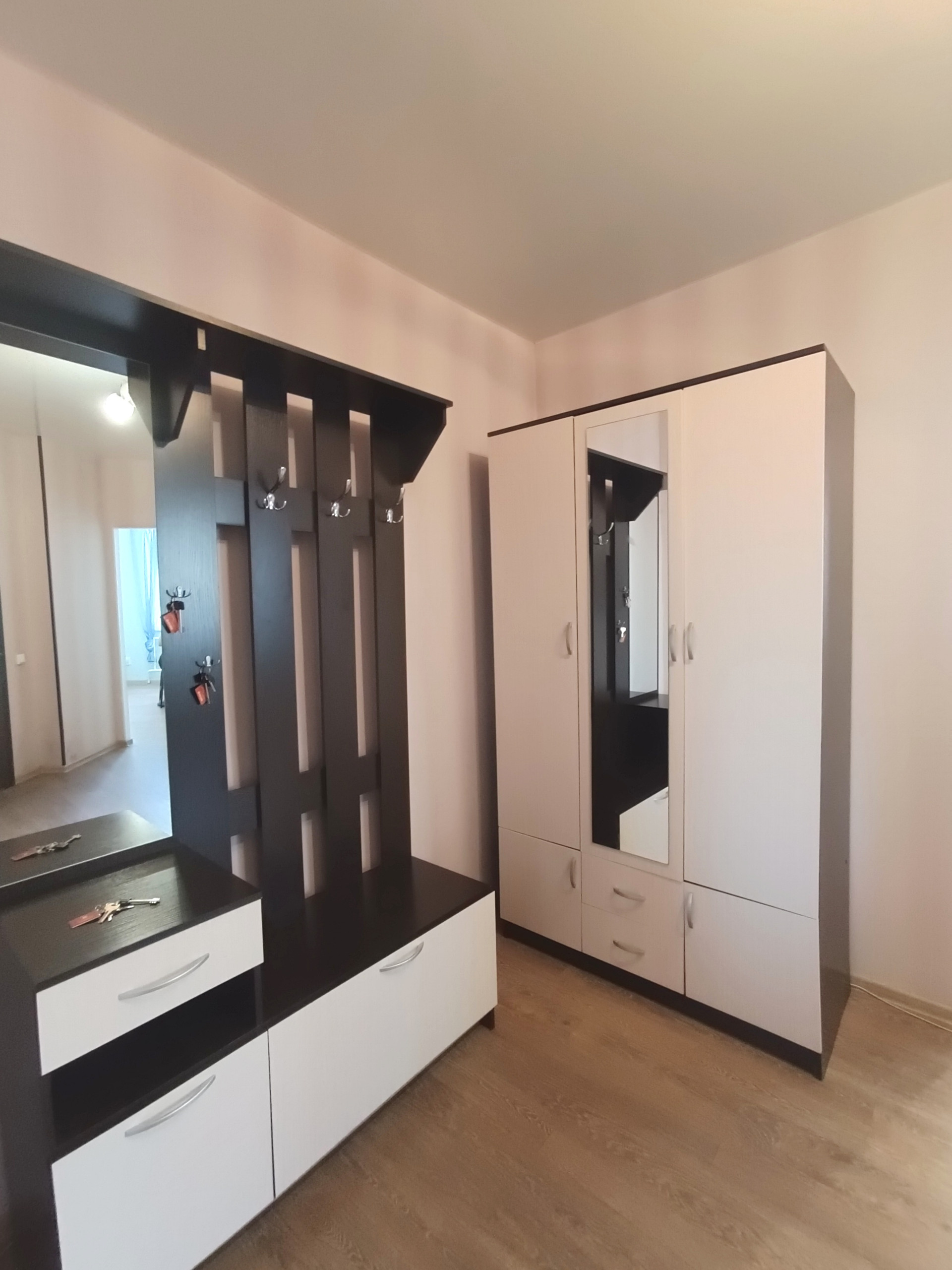 Отличный ремонт, полностью мебелирована, кухонный гарнитур, электрическая плита, холодильник, стиральная машинка, кондицирнер, телевизор, диван, двухспальная кровать, платяной шкаф, гарнитур в коридоре, стол, стулья, гладильная доска, сушилка для белья.
