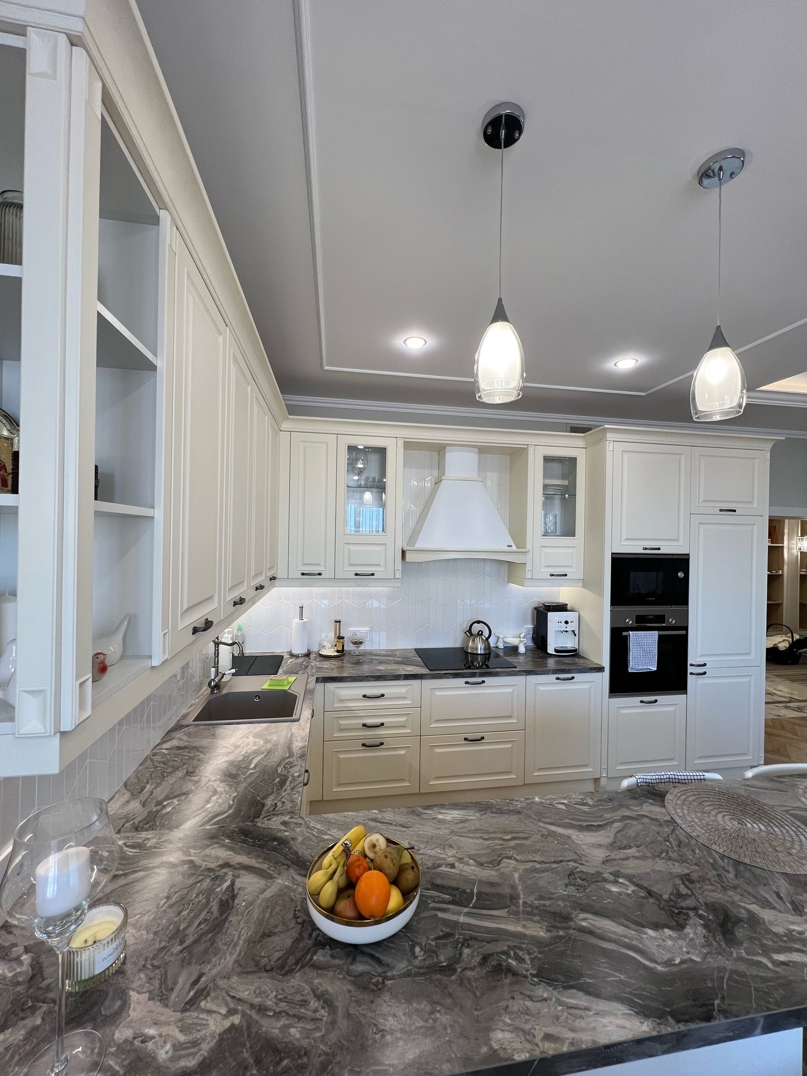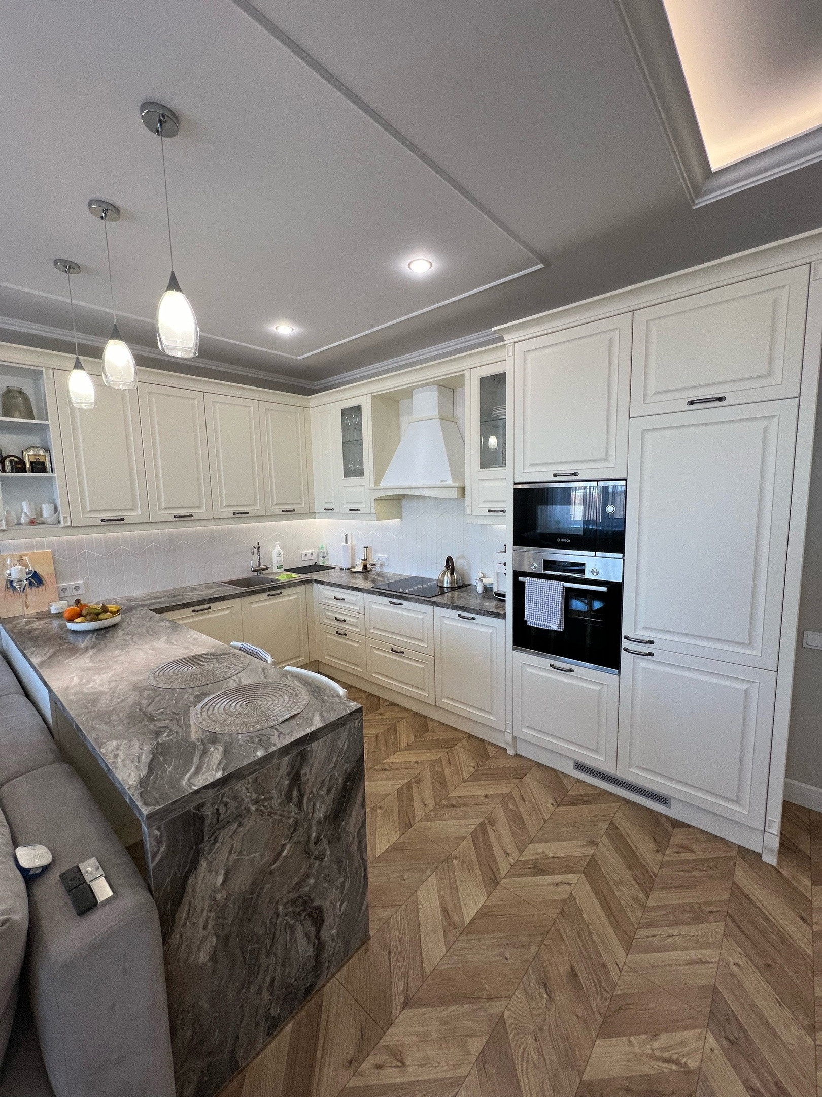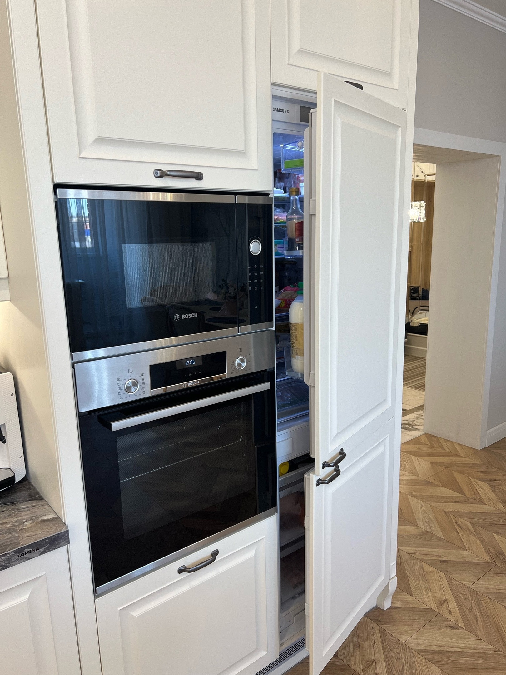 Kухня Lоrеna, с качественной фурнитурой и доводчиками на всех шкафчиках, вся встроенная техника Воsh ( посудомойка, варка, духовка, микроволновка)