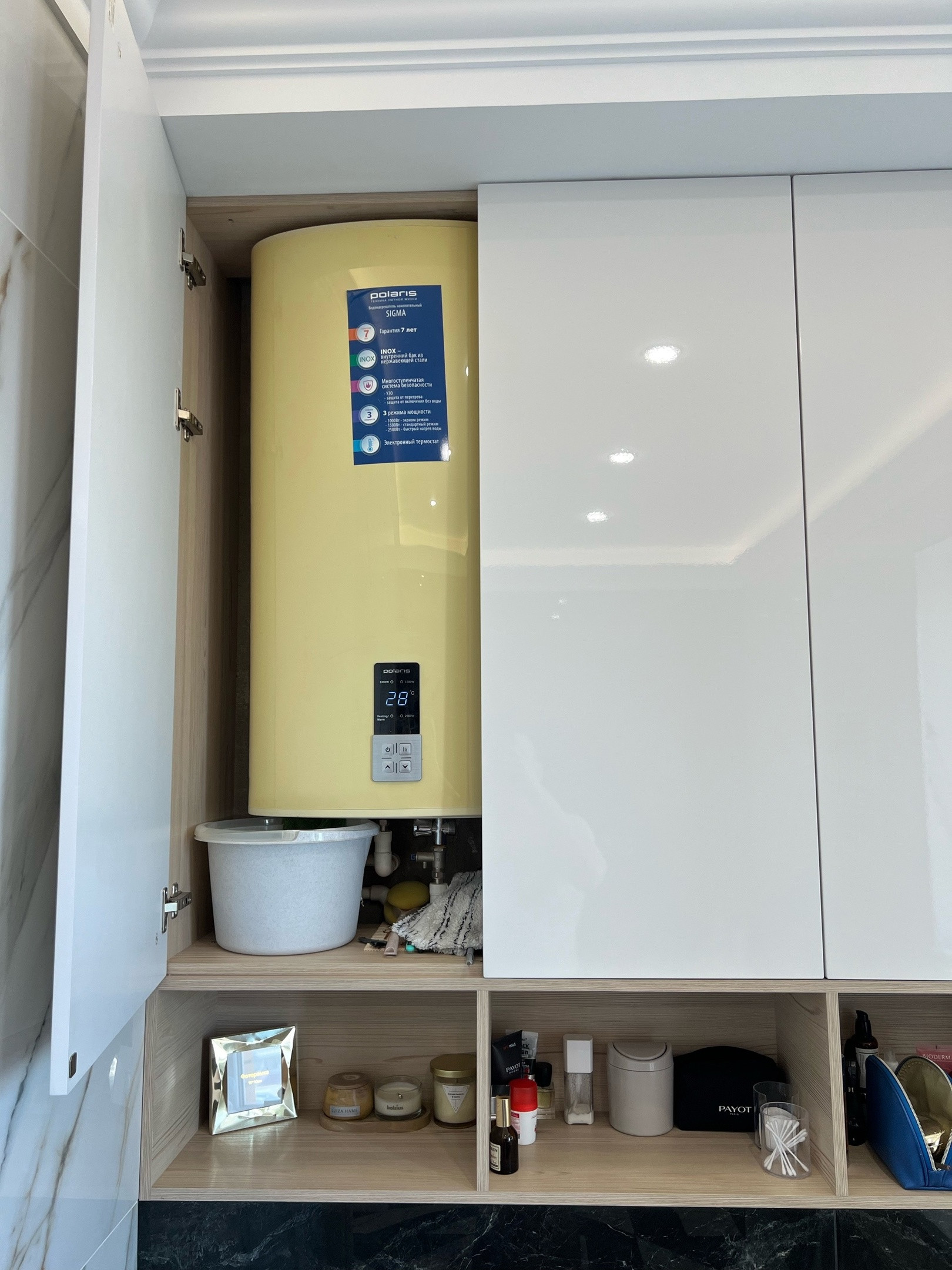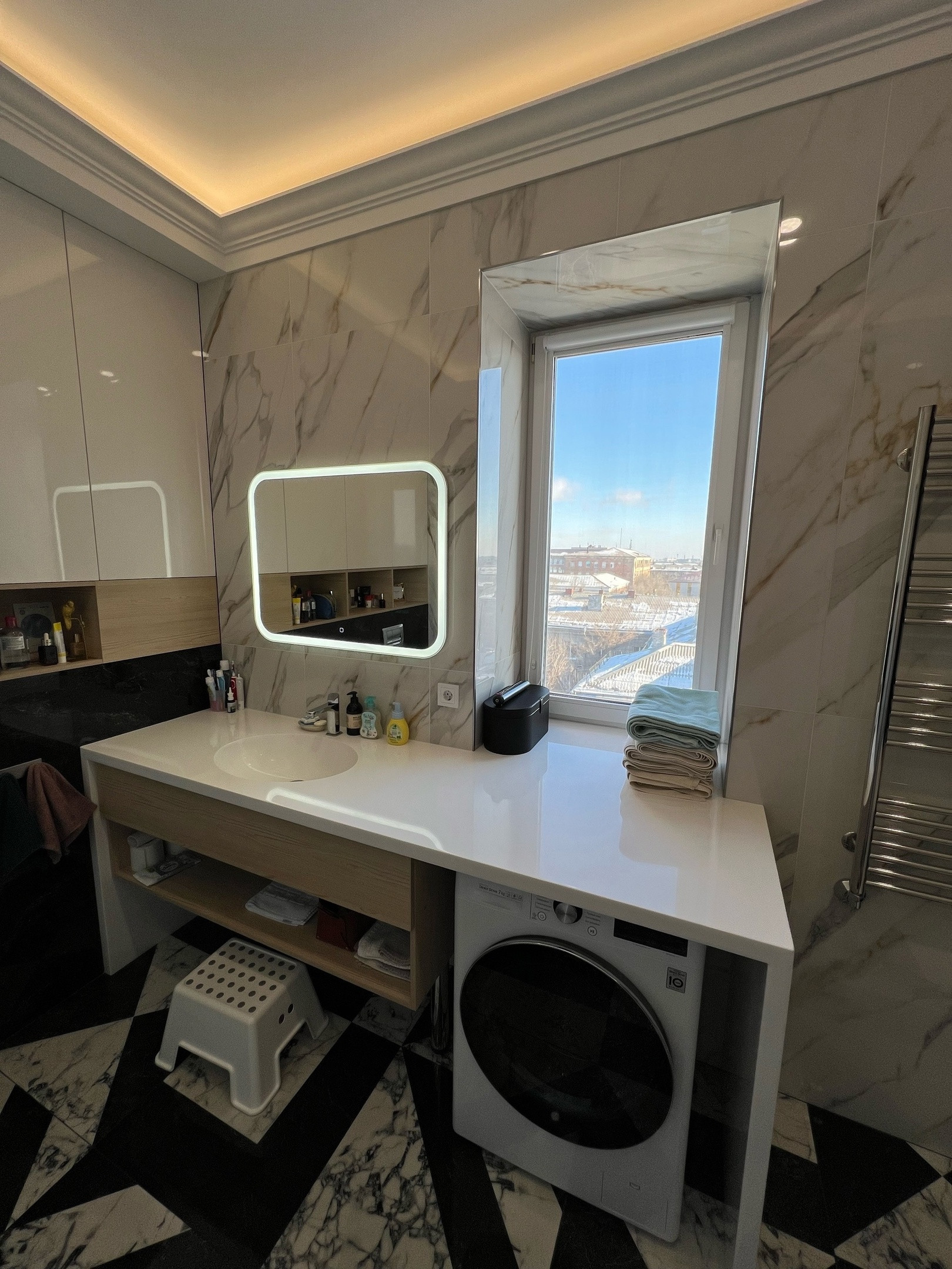 выполнена из кафеля kеrаmа mаrаzzi, установлена красивая каменная столешница с раковиной, итальянская ванна, водонагреватель и теплые полы.