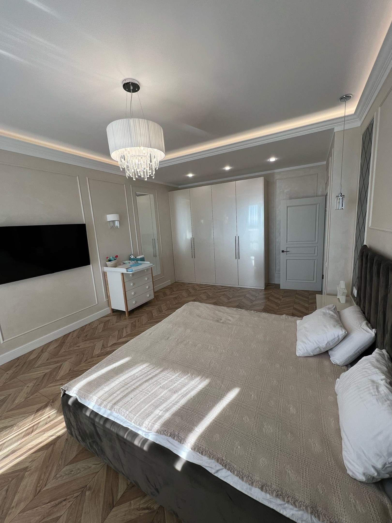 Взрослая спальня с большим шкафом и кроватью, стены из венецианки!