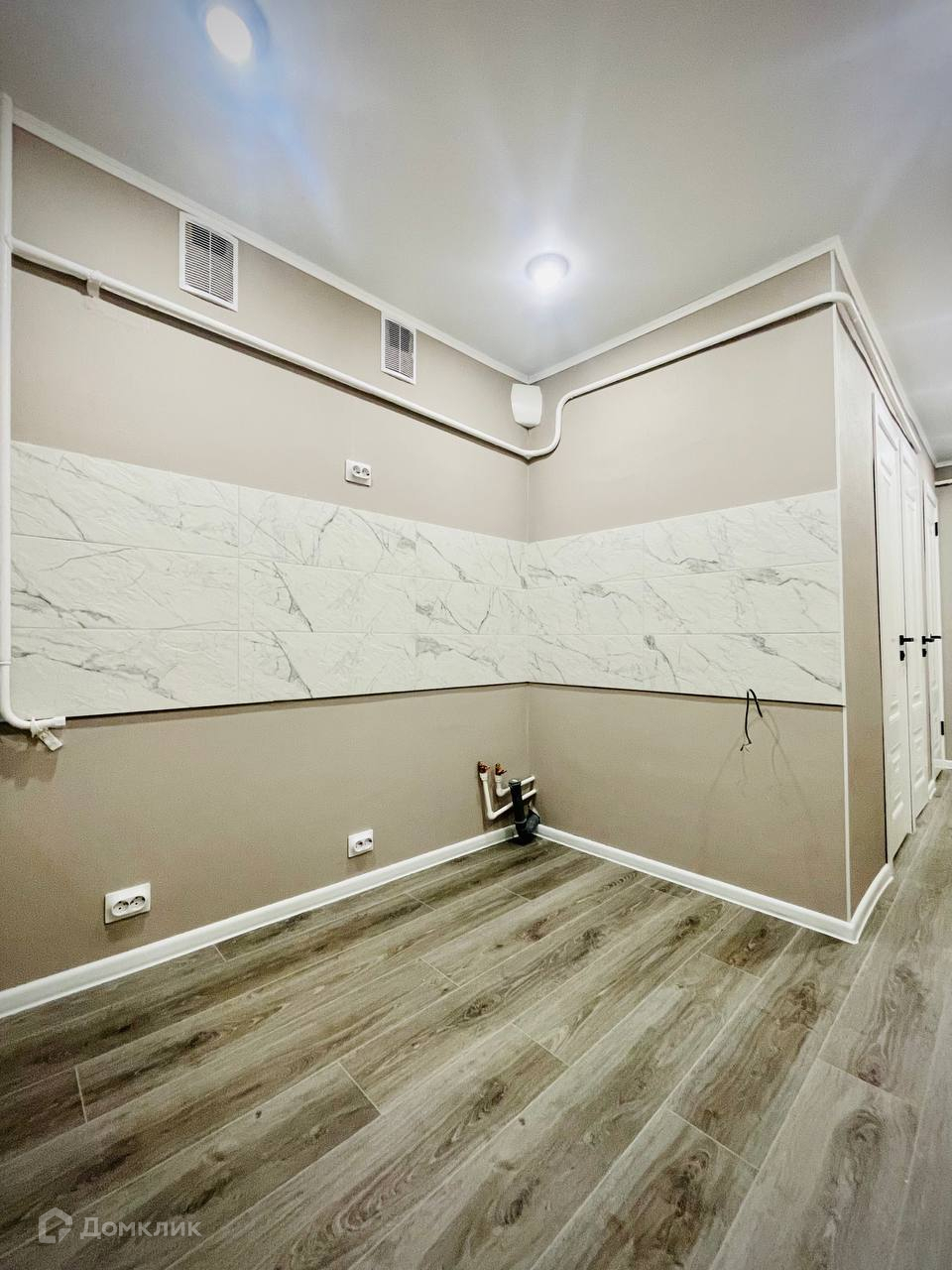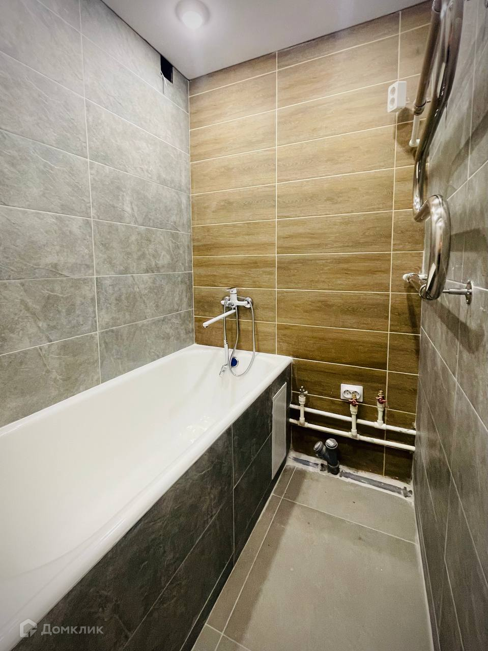 Ванна в керамограните под бетон и кафель под дерево, фартук кухни керамогранит под мрамор.