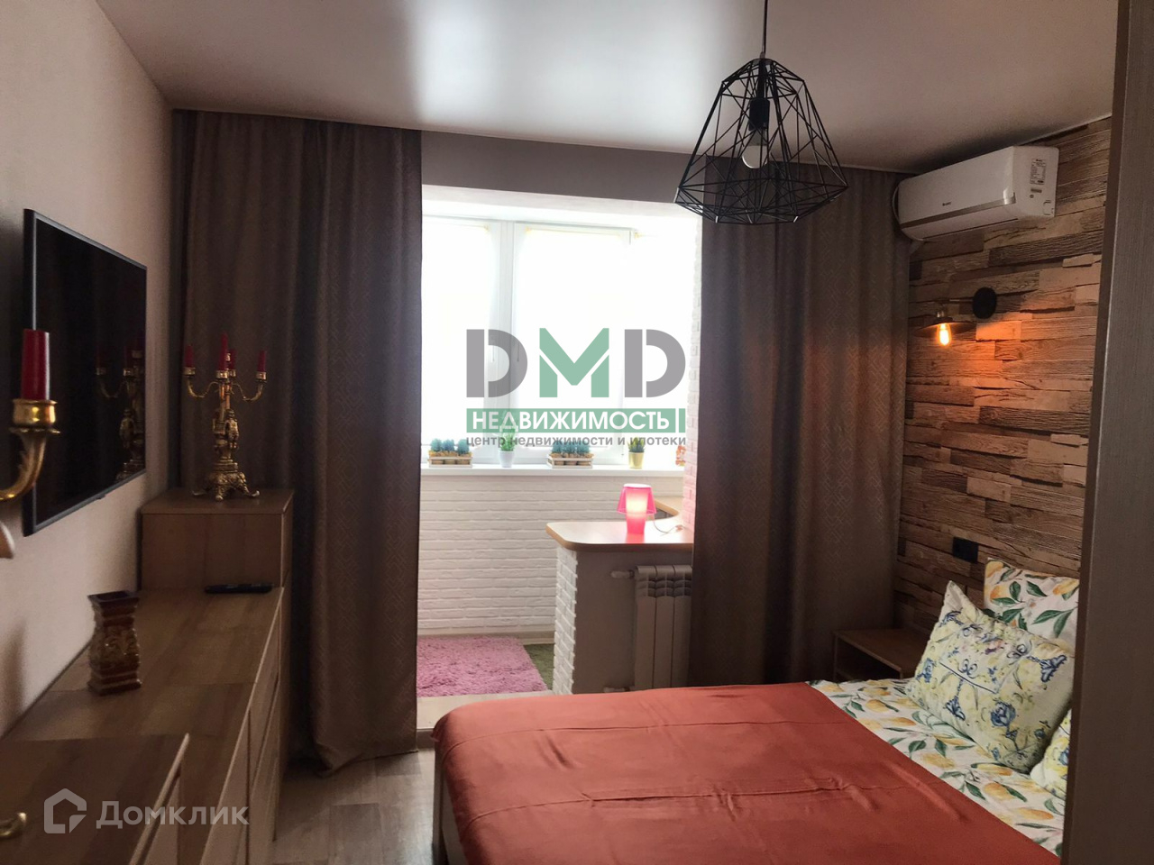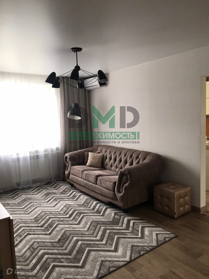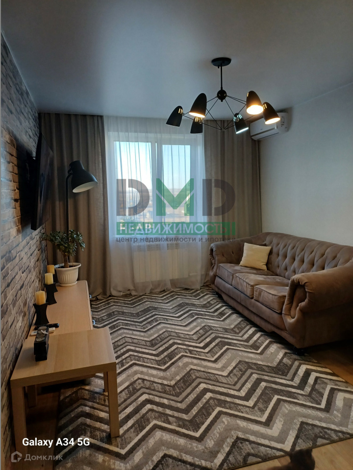 Светлая гостиная наполняется естественным светом благодаря окну. В комнате кондиционер, что создаёт комфортную атмосферу для отдыха и общения с близкими.