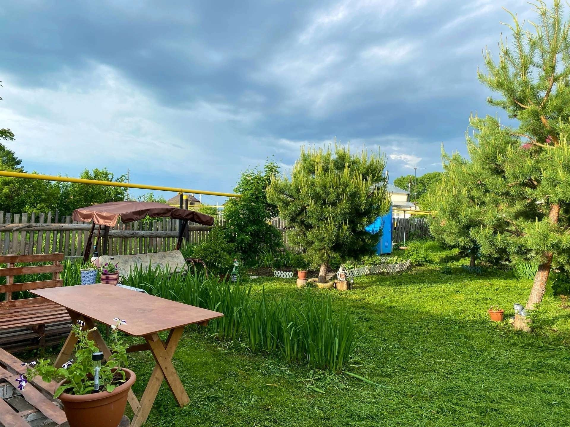 На участке все благоустроенно, место для отдыха, по периметру растут хвойные деревья (сосна, ель), 2 теплицы (одна 6 метров, вторая 8 метров), плодово-ягодные деревья, сад плодоносящий. На участке построено здание из пеноблока, ранее предназначалось как курятник, к нему проведено электричество. Также имеется вальер (5х5 метров), для двух собак.