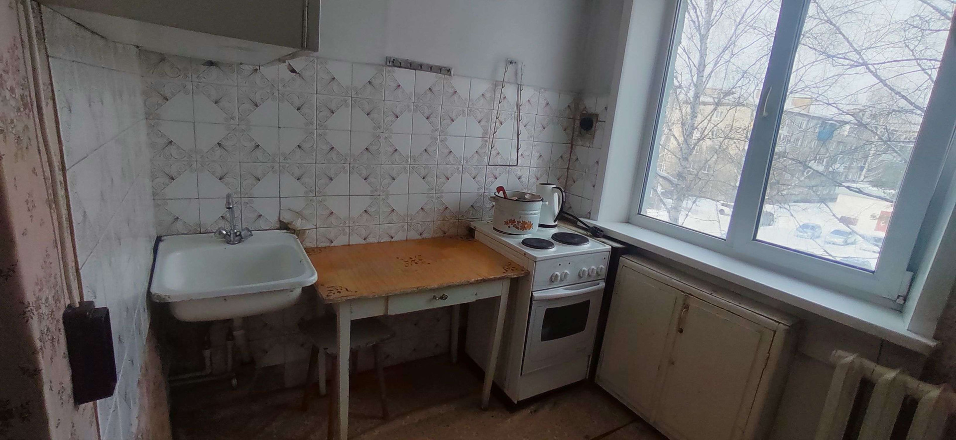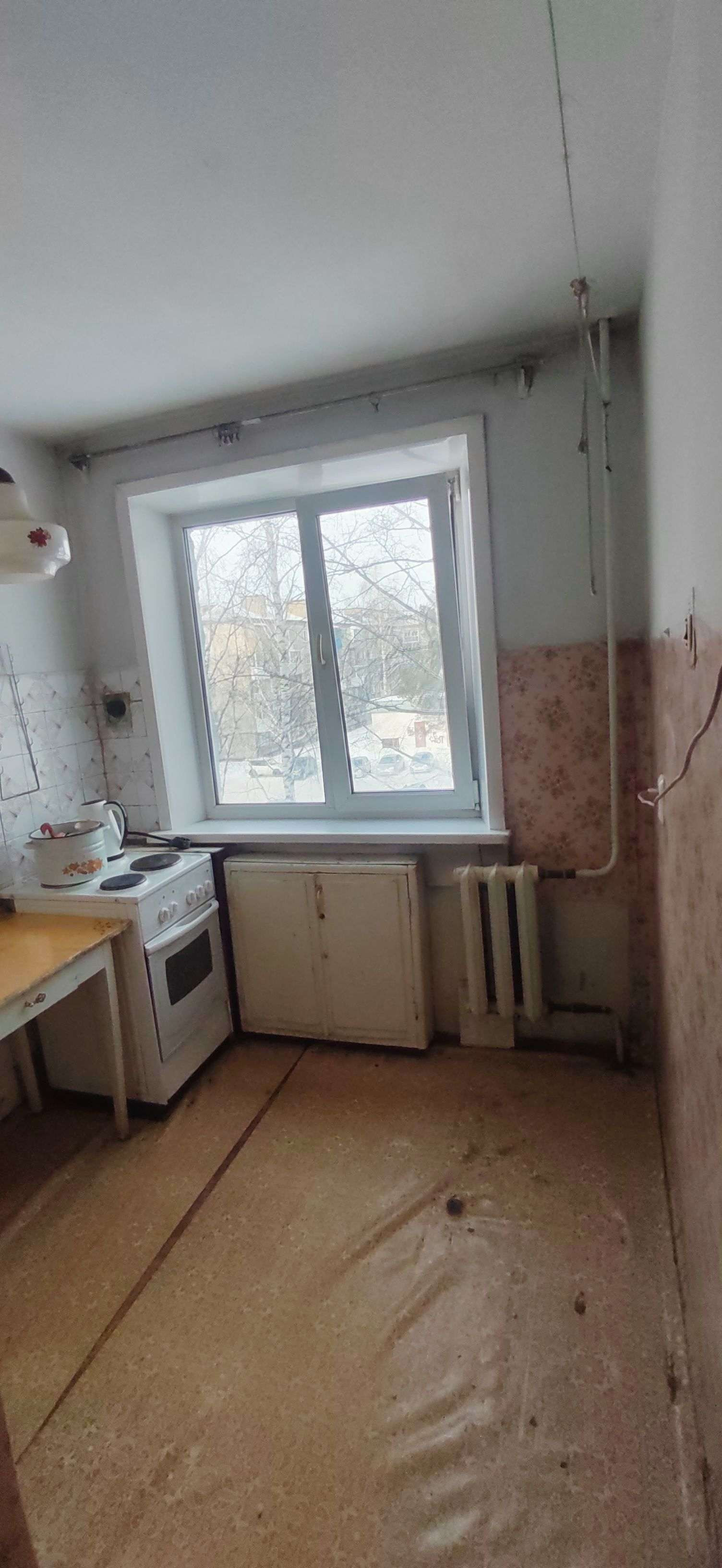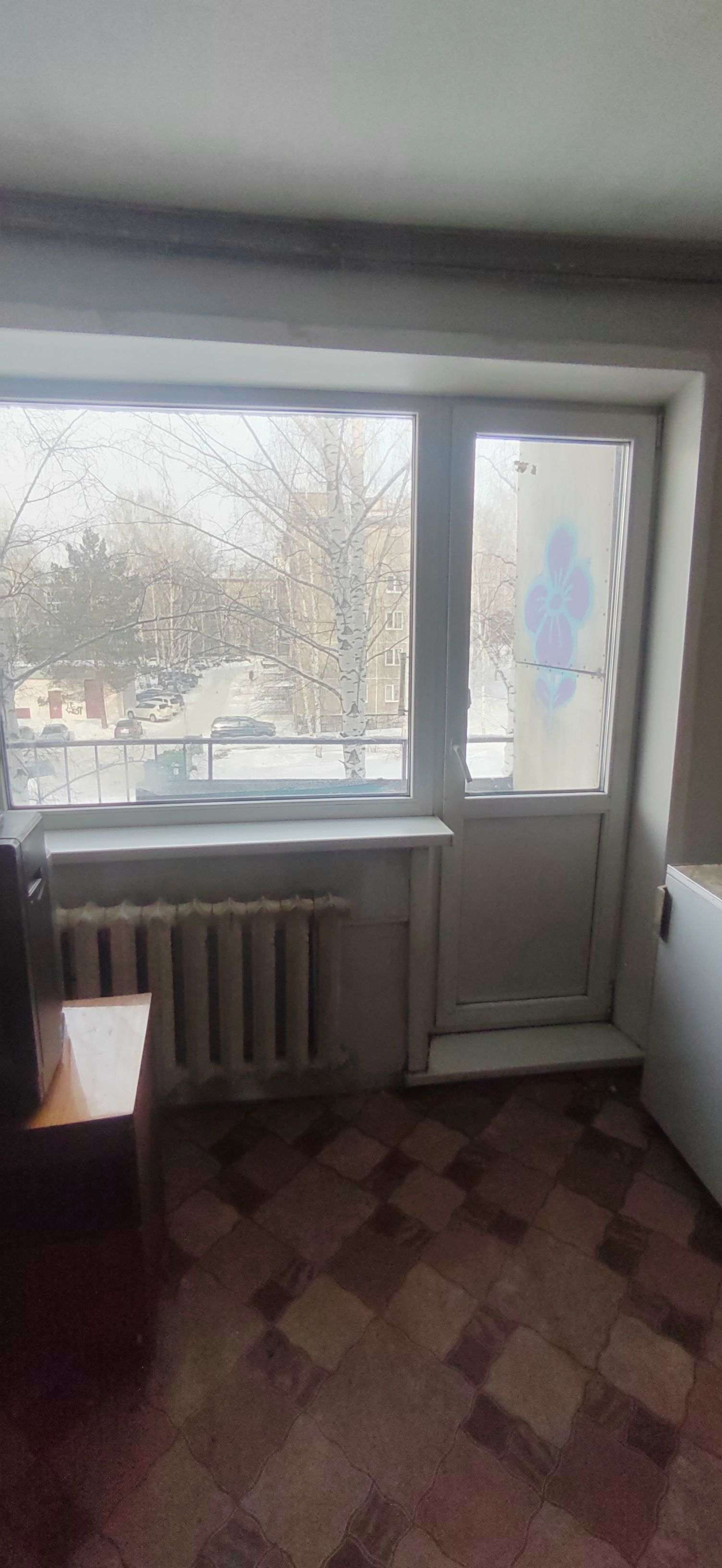 Квартира требует ремонта, установлены пластиковые окна, металлическая входная дверь.