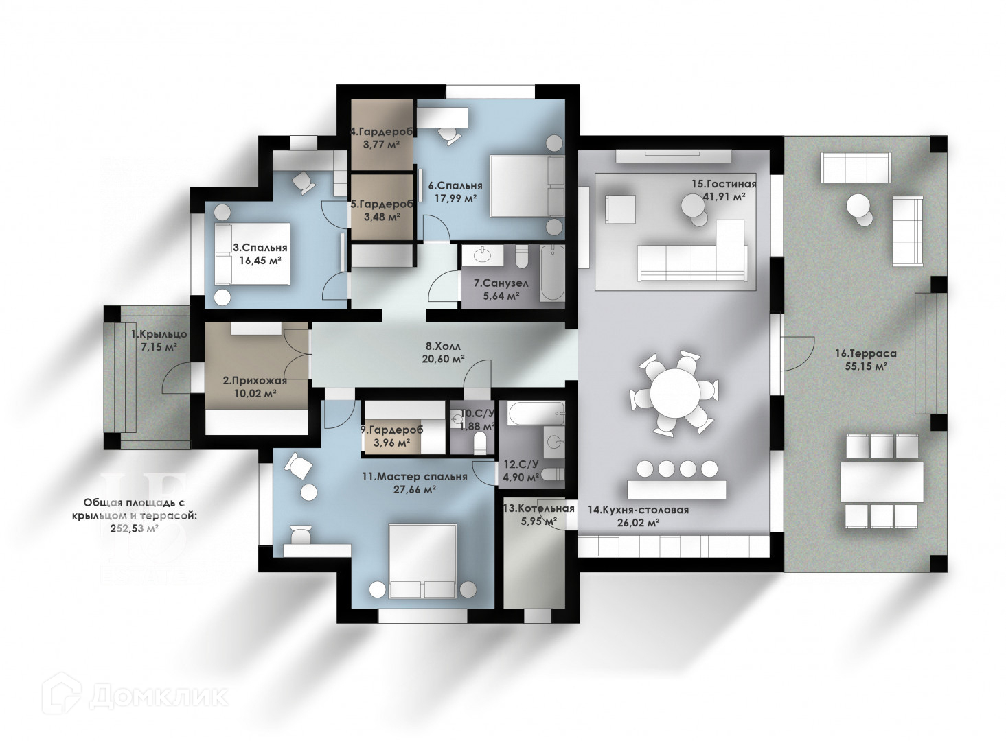 Первый этаж - прихожая, холл, гостиная-кухня-столовая с выходом на террасу, мастер-спальня со своим с/у и гардеробной, две спальни, каждая со своей гардеробной и общим с/у, гостевой с/у, котельная.