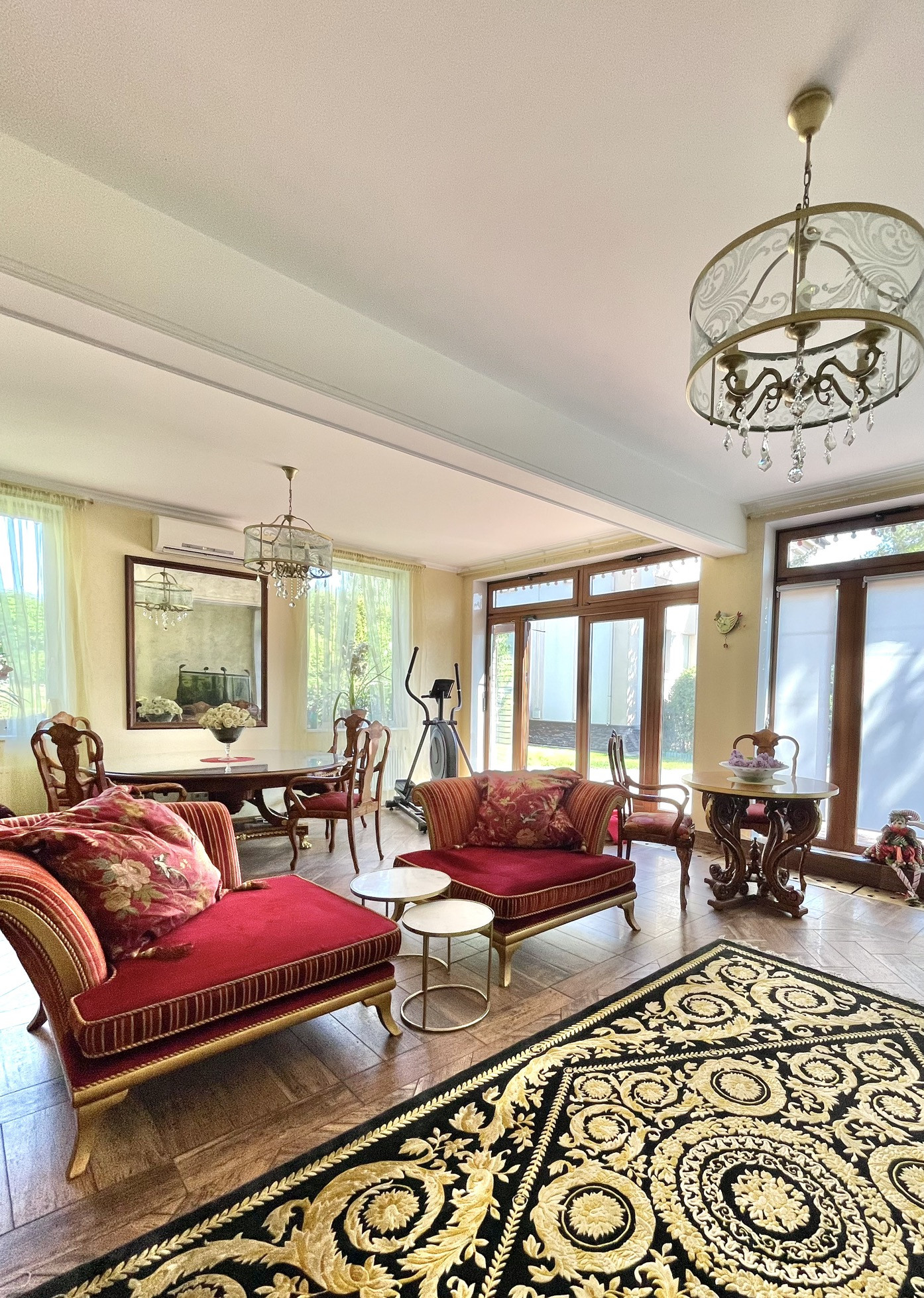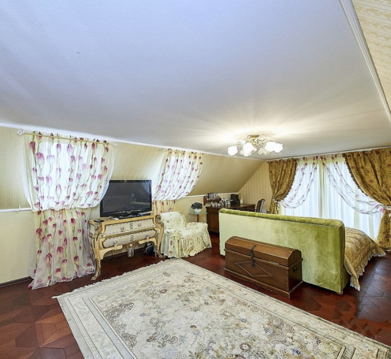 прихожая, просторная гостиная 28 м2, кухня-столовая 25 м2, гостевая комната 22 м2, с/у, огромная гардеробная (19 м2) с высотой потолка 4,5 м