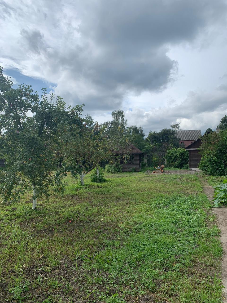 На участке посажены плодово ягодные деревья и кустарники, стоит небольшая теплица.