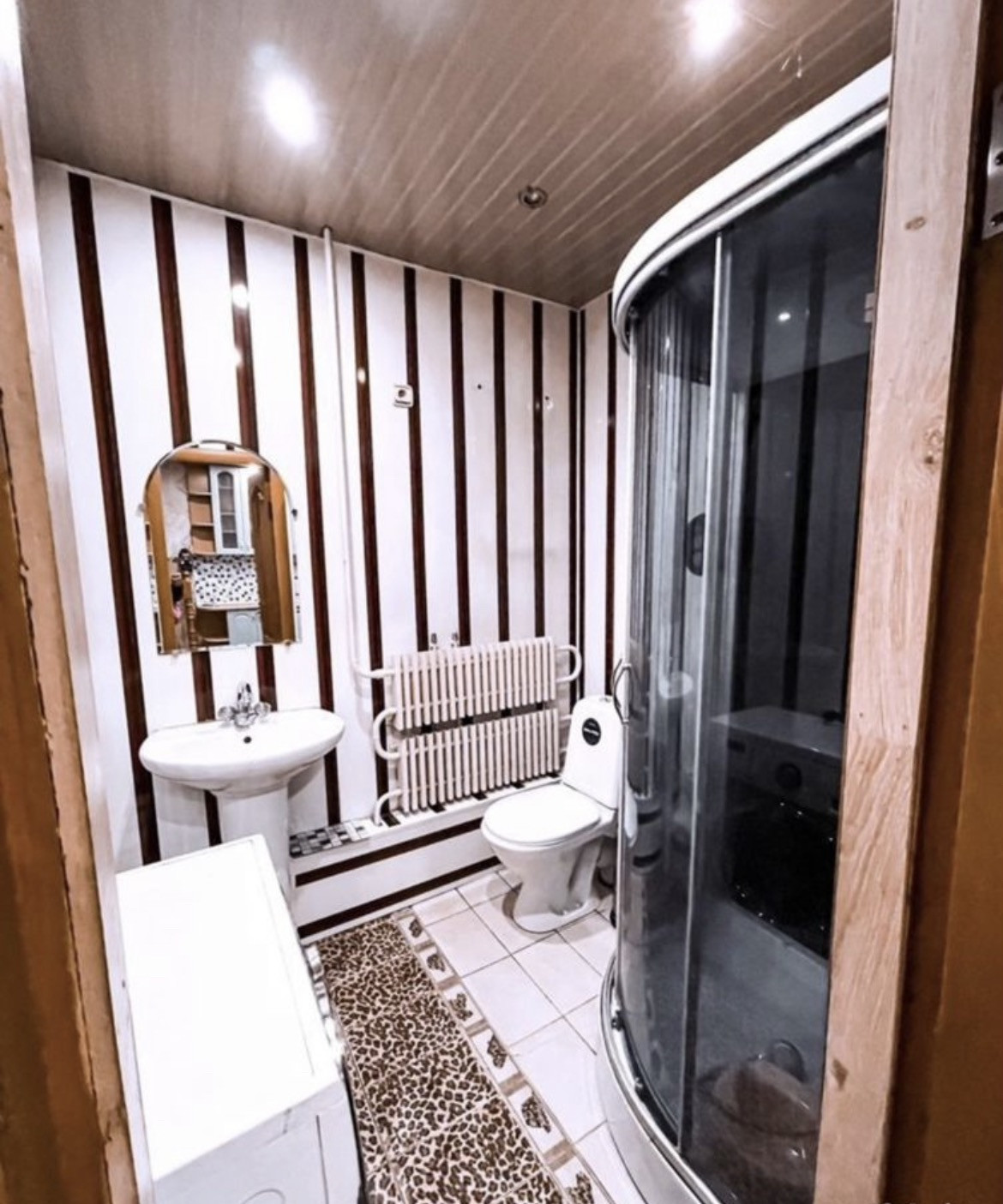 Санузел в доме, душевая кабина, стиральная машина.