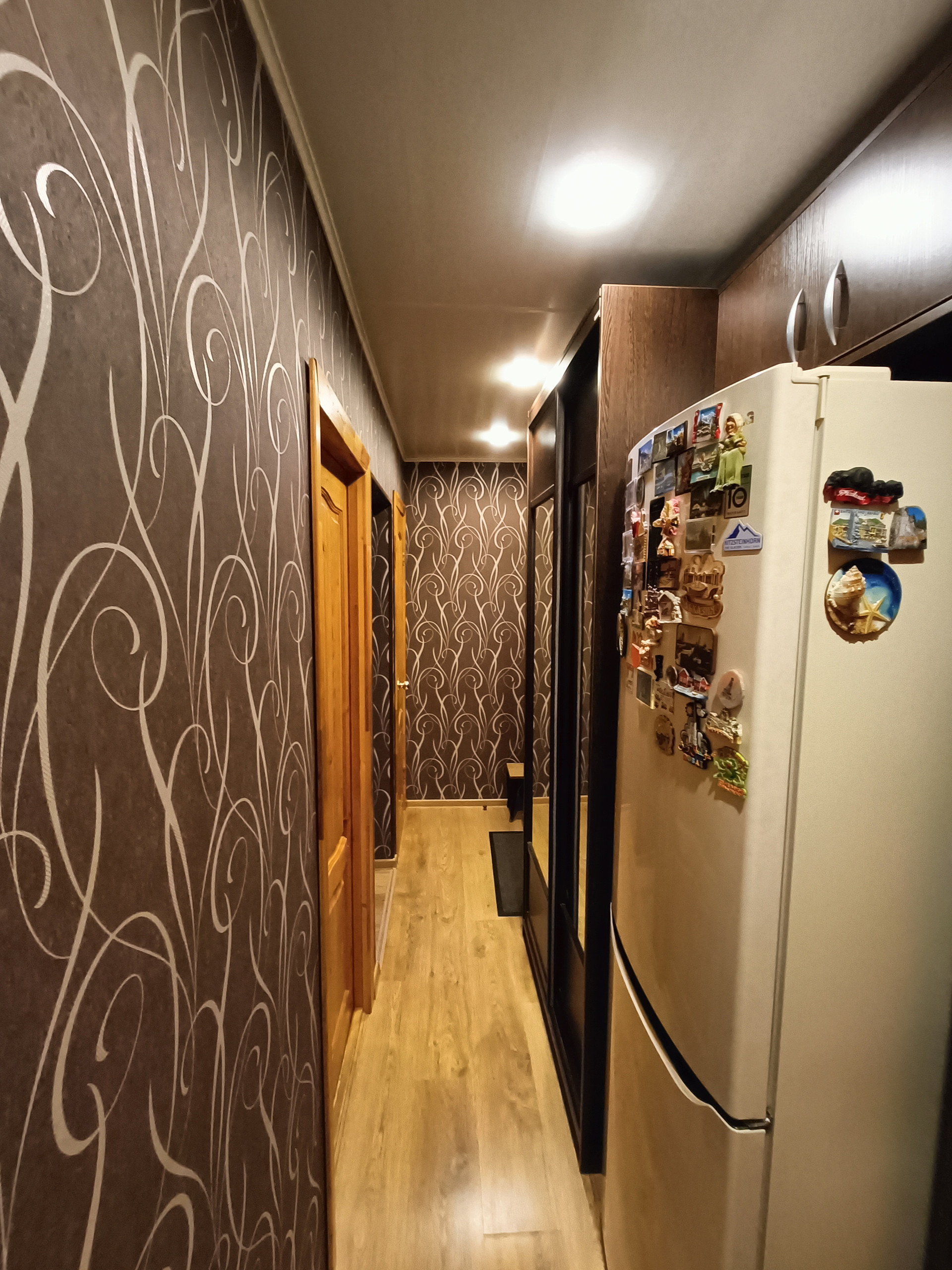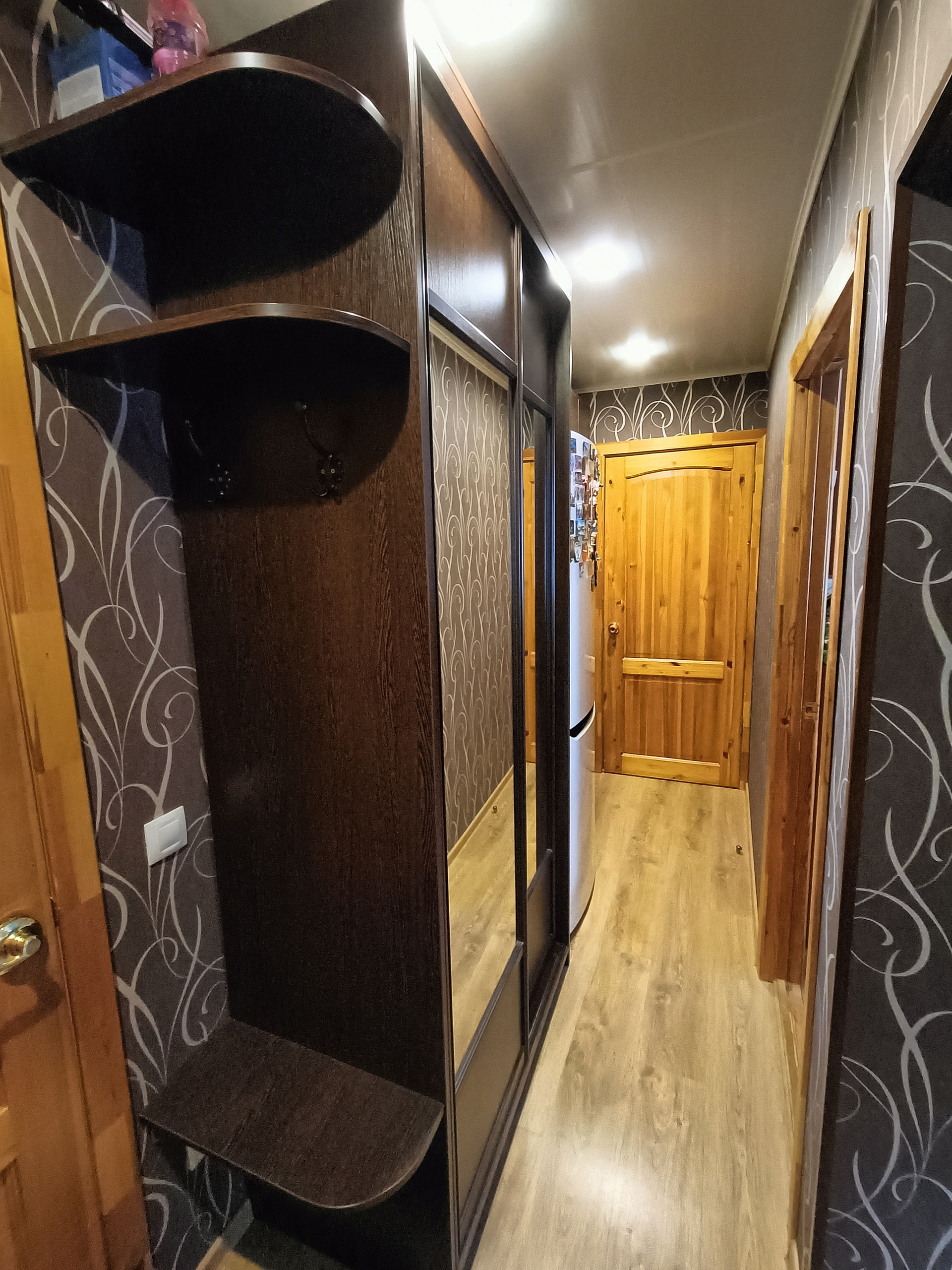 - Вместительная, очень качественная прихожая KOMANDOR сделана на заказ, имеет встроенный зеркальный шкаф-купе и множество ящиков с полками для хранения вещей. Предусмотрена специальная ниша под холодильник, что очень экономит место на кухне;