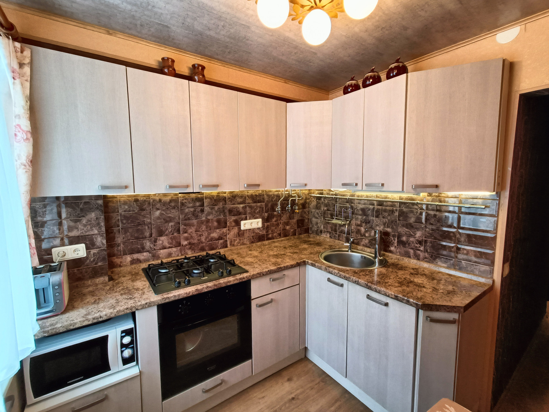 - Удобная кухня MARIA со встроенной техникой, включая посудомоечную машину Hotpoint Ariston, а также встроенной светодиодной подсветкой, все шкафы с доводчиками. В скрытой нише установлена новая газовая колонка, имеется счетчик на газ;