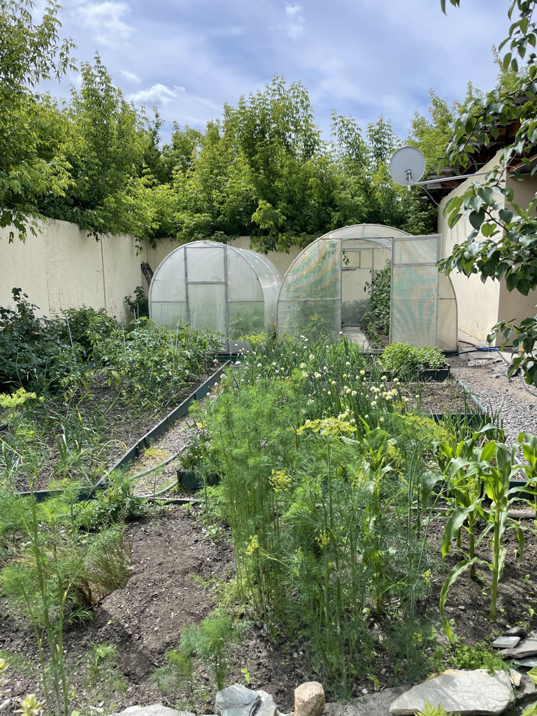 На участке выполнен ландшафтный дизайн, имеется множество цветов, плодоносящие деревья, кустарники, огородная часть, теплица, организованы дорожки с освещением.