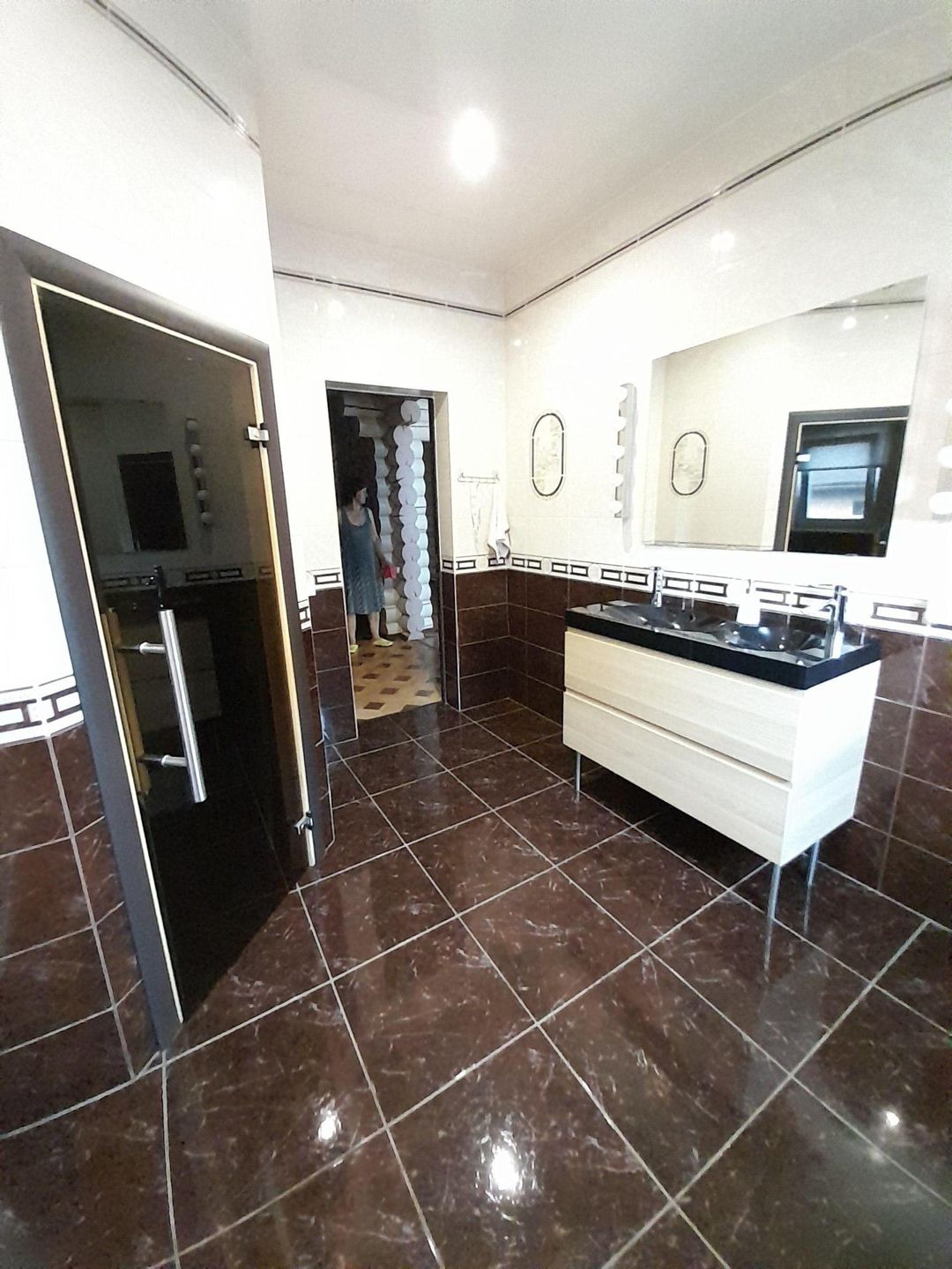 1 этаж - кухня-столовая 27 кв.м., большая ванная комната, туалет, котельная- подсобная, просторная гардеробная.
