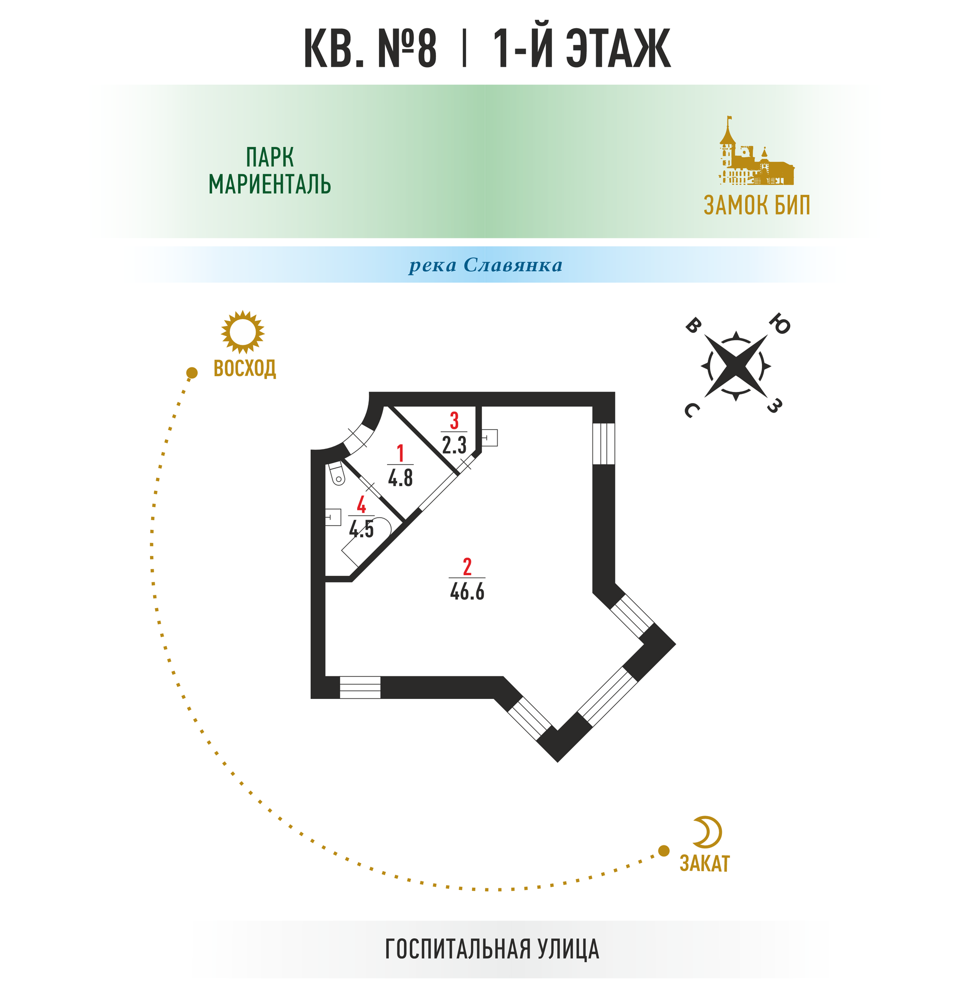 Квартира расположена в новом жилом малоэтажном комплексе, рядом с парком Мариенталь и замком БИП, в исторической части Павловска. В шаговой доступности — река Славянка, Мариентальский пруд и все достопримечательности парка.