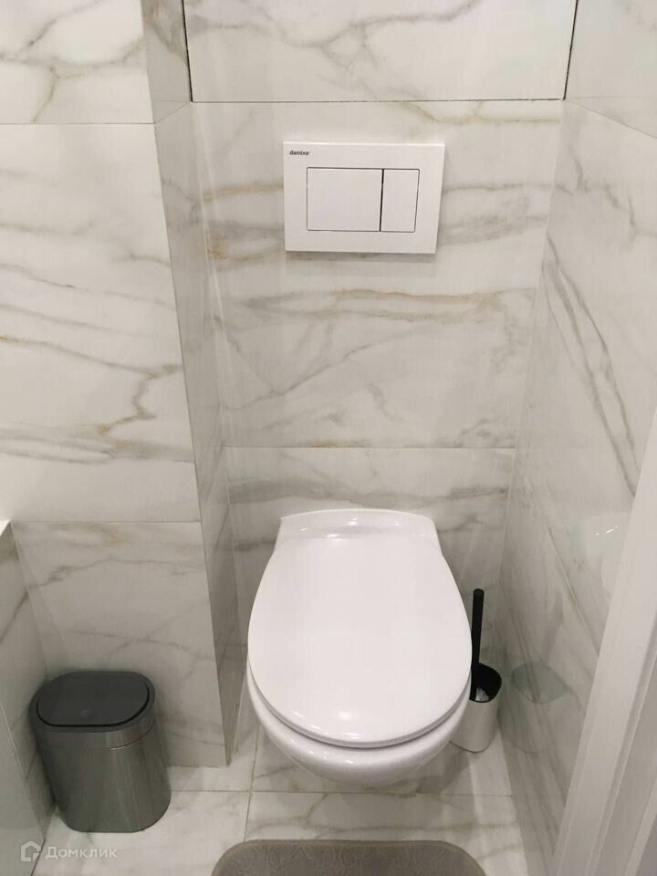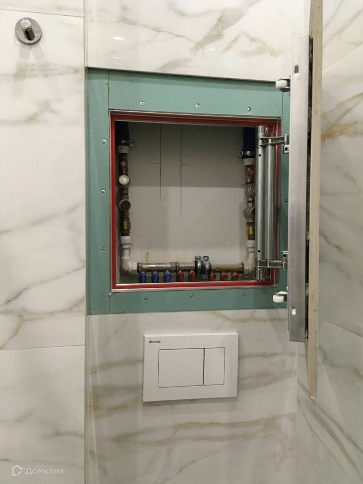 Совместный санузел. В ванной встроена инсталляция, над которой находится распределительный щиток с водой. Он спрятан под лючок. Натяжной потолок по всей квартире. Также большой вместительный шкаф, где можно хранить всё.