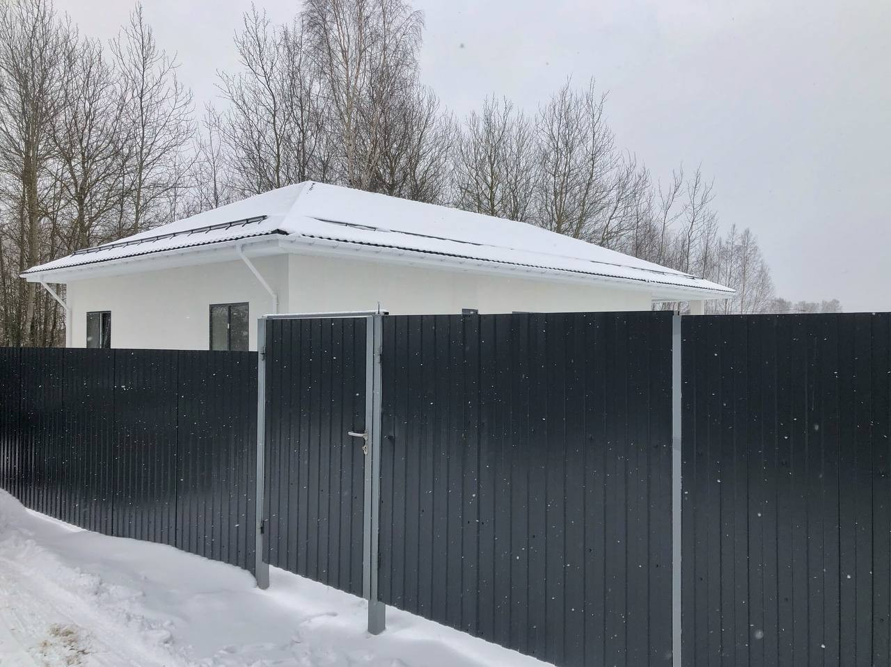 - Ограждение евроштакетник с калиткой и створчатыми воротами с лицевой стороны и сетка-рабица между соседними участками.