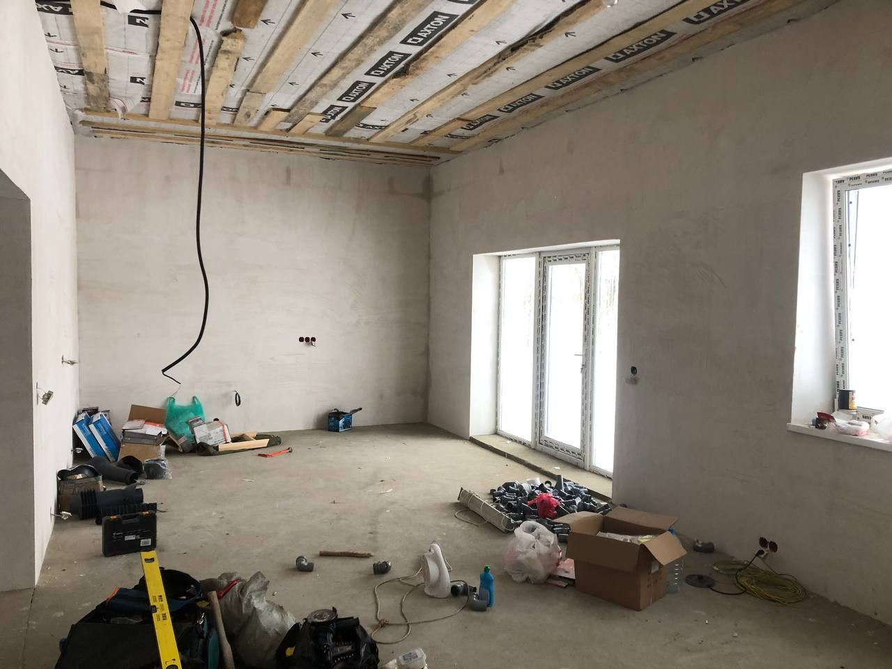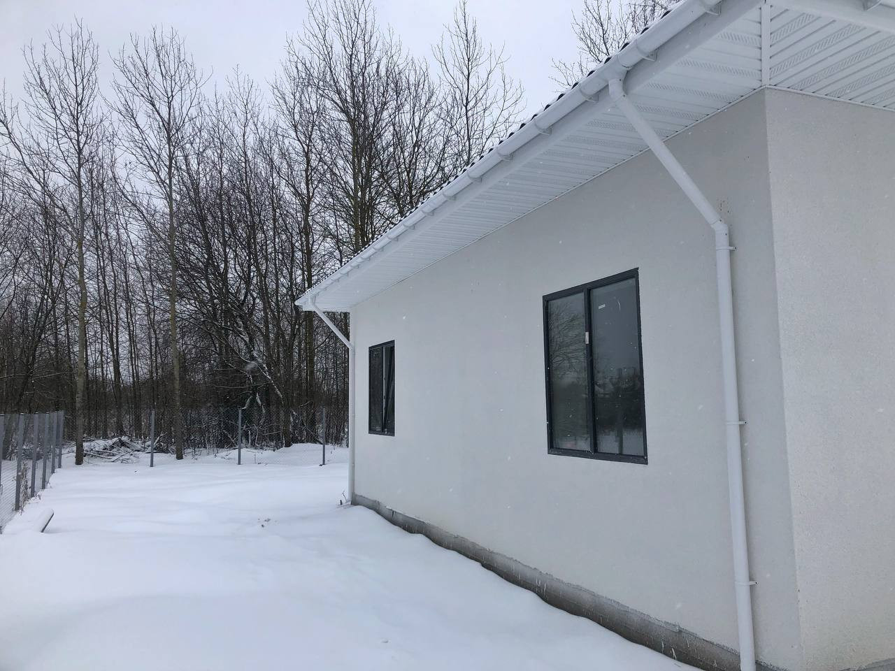 Дом одноэтажный построен из пеноблоков площадью 116 кв. м. В доме огромная кухня-гостиная с выходом на террасу, три комнаты, санузел, холл и техническое помещение.