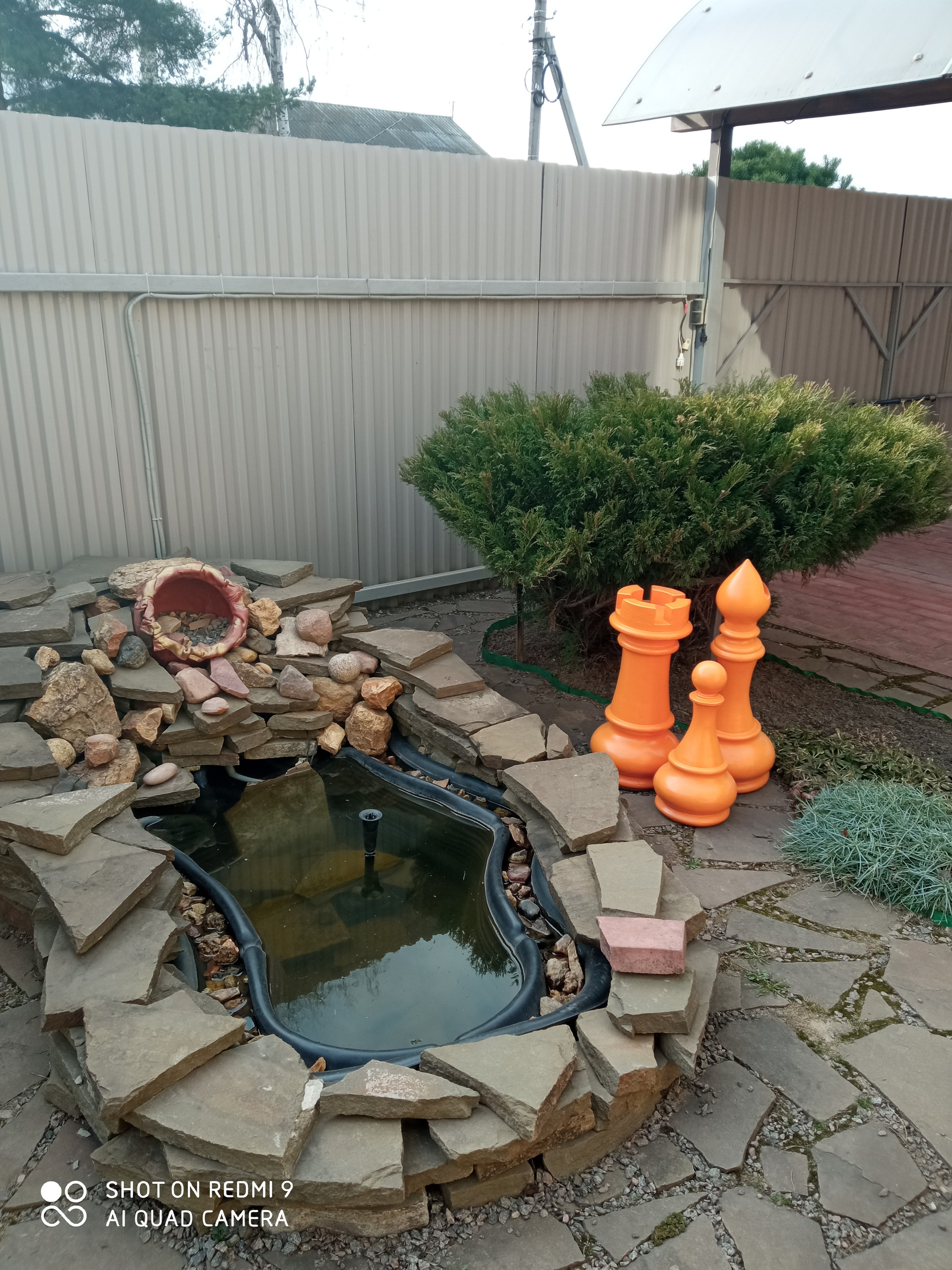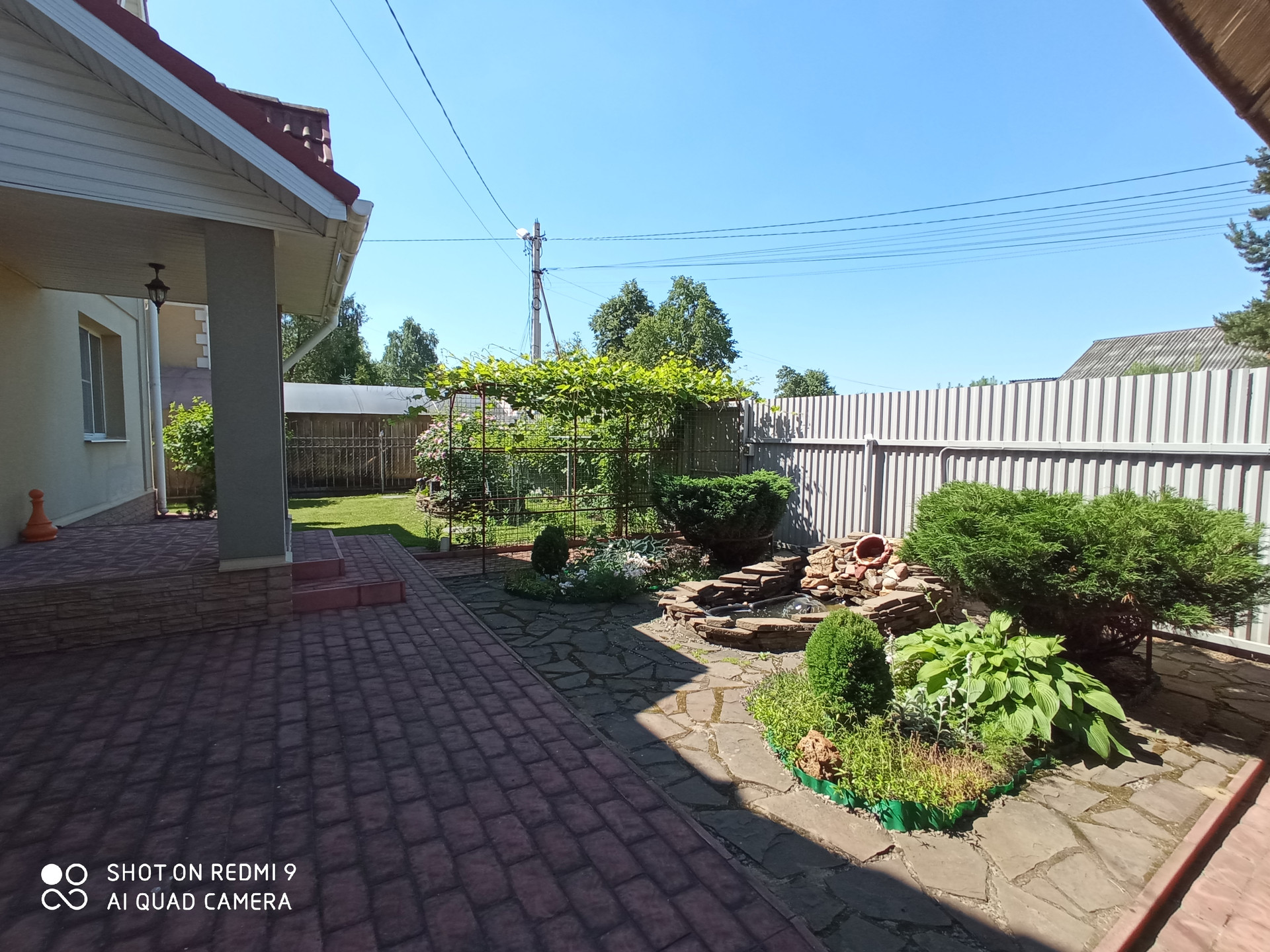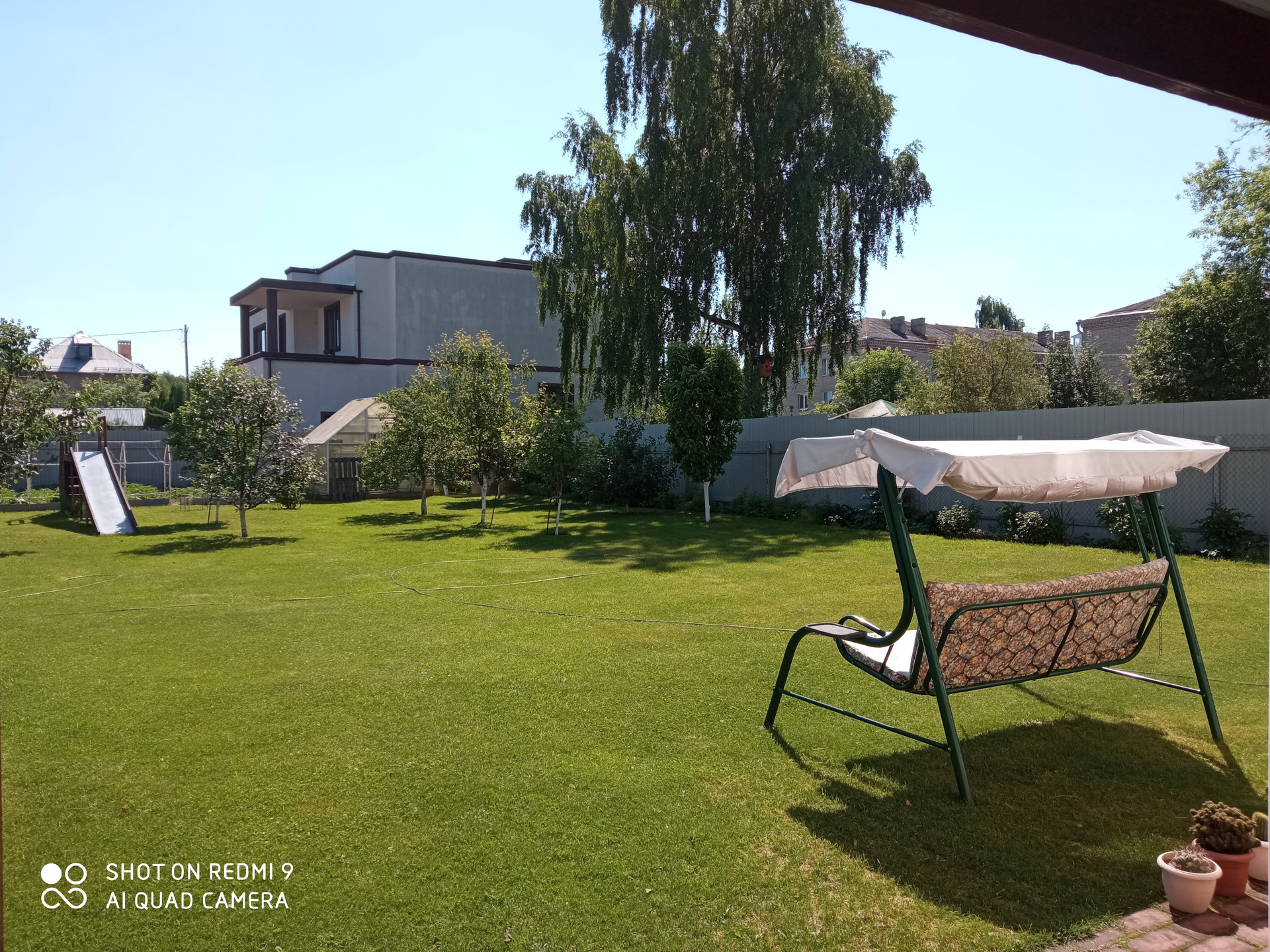 На участке теплица, плодовые деревья и кустарники, газон, декоративный фонтан.
