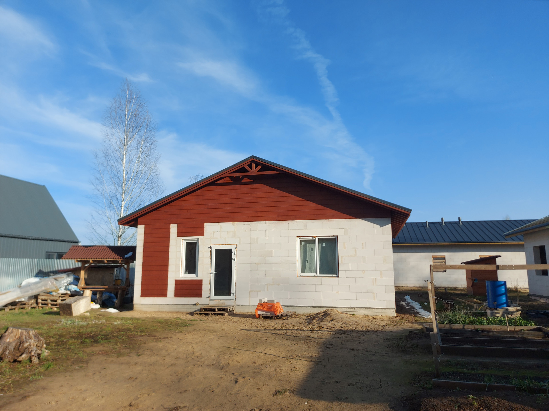 Фасад частично отделан имитацией бруса, который покрашен фасадной краской.