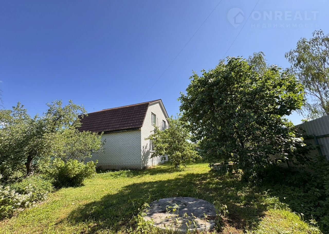 Участок огорожен забором. На участке стоит беседка, растут деревья, многолетние цветы.