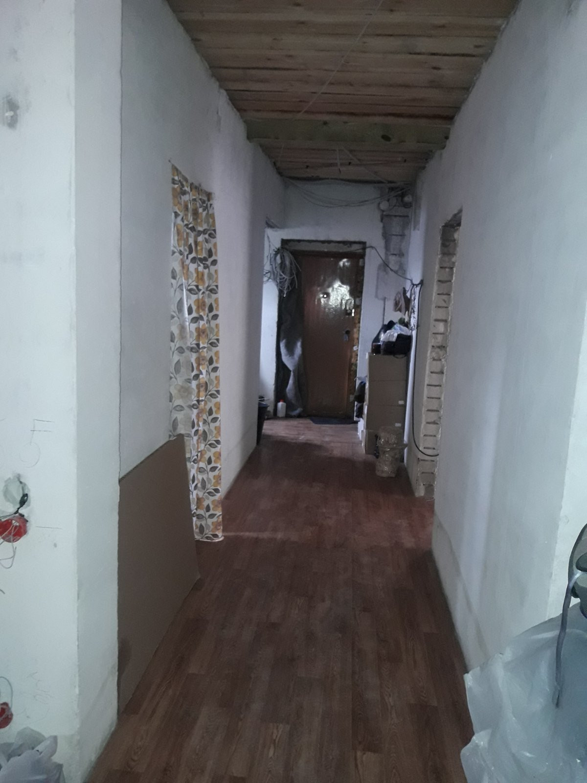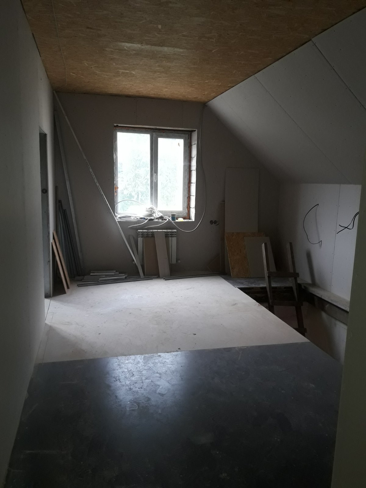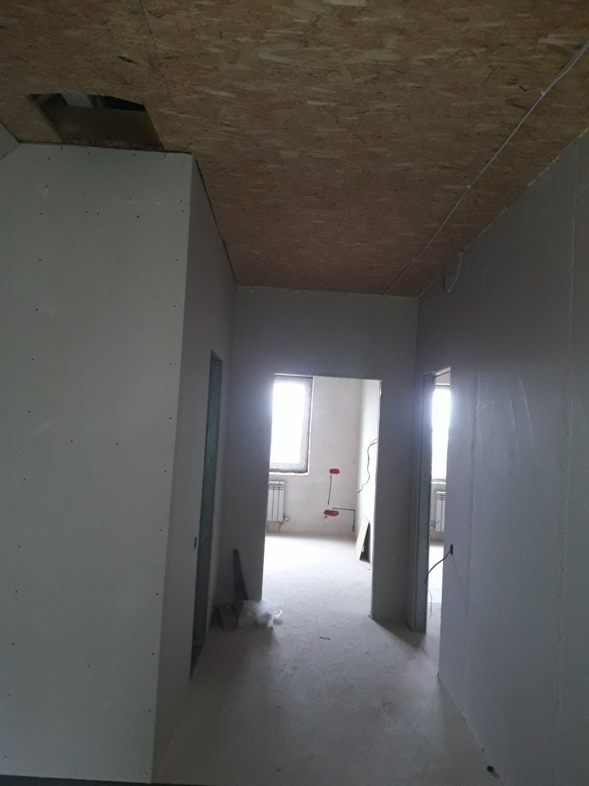 На 1м этаже чистовая стяжка с теплым полом, кирпичные перегородки оштукатурены, на 2м этаже установлены гипсокартонные перегородки.