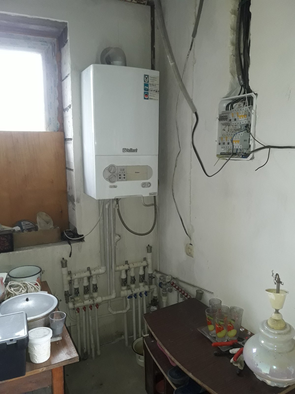 В доме сделана предчистовая отделка: разведена электропроводка, отопление с пласт трубами и биметаллическими батареями от газового котла – Вайлант, смонтирована подводка воды в санузлах на 1м и 2м этажах.