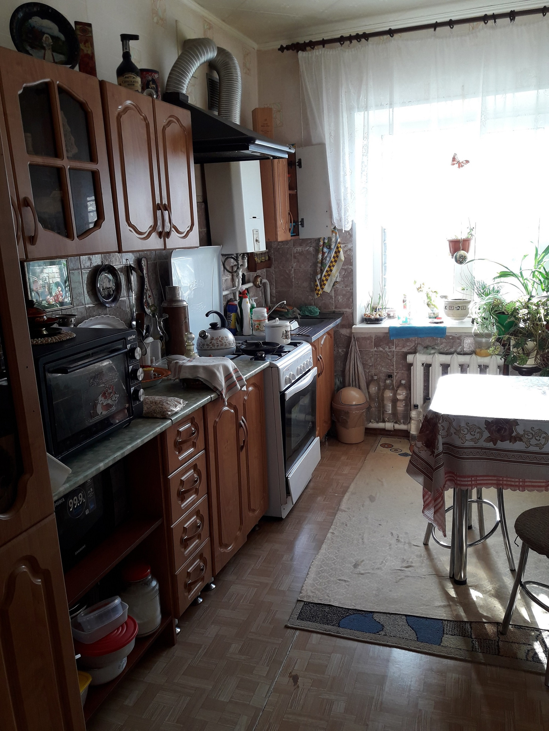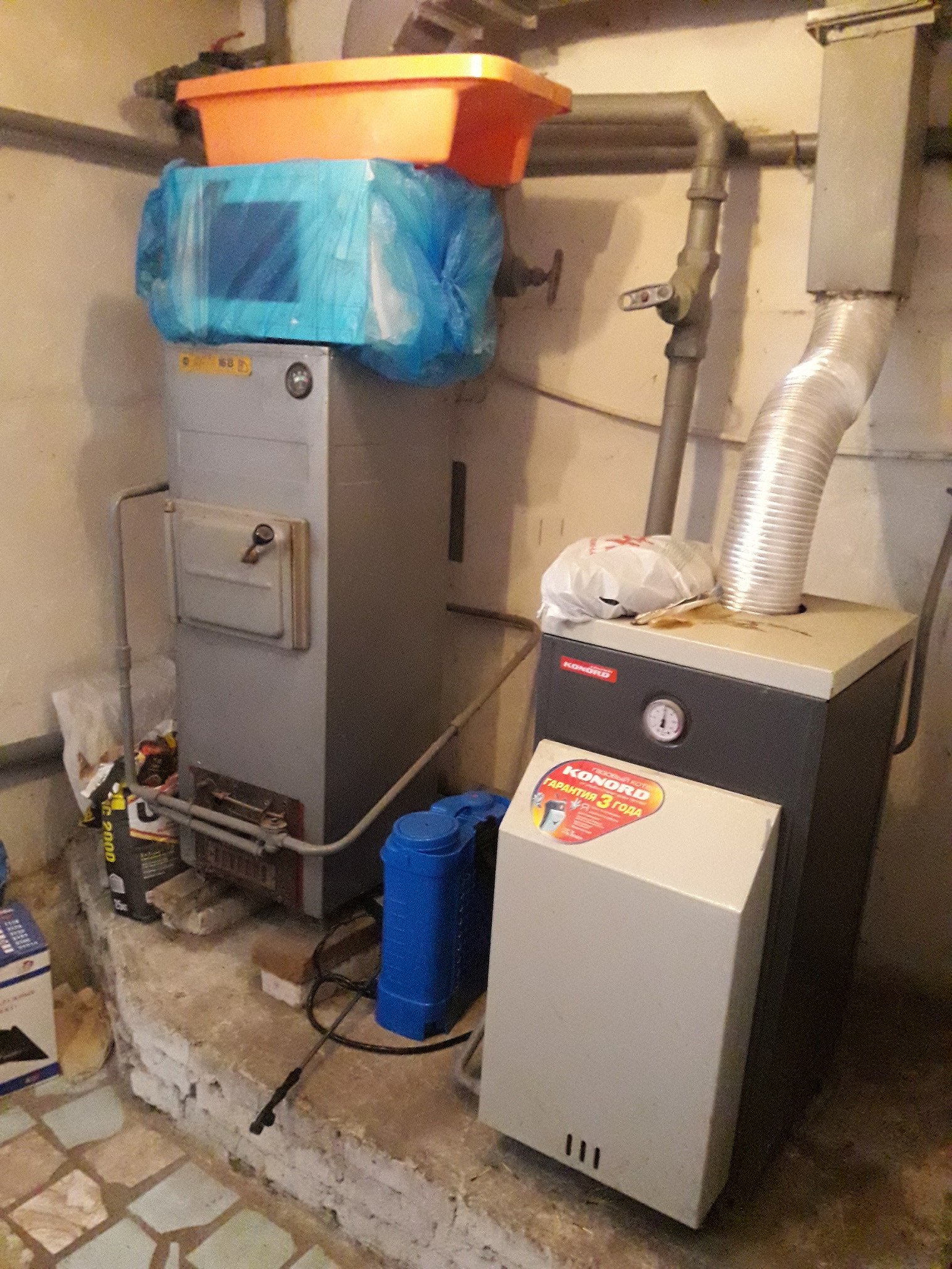 Котельная с двумя газовыми напольными котлами отопления (один котел резервный, в исправном состоянии). Перекрытия в доме – железобетонные плиты, стяжка пола керамзитобетонная, деревянные лаги, ДСП, линолеум.