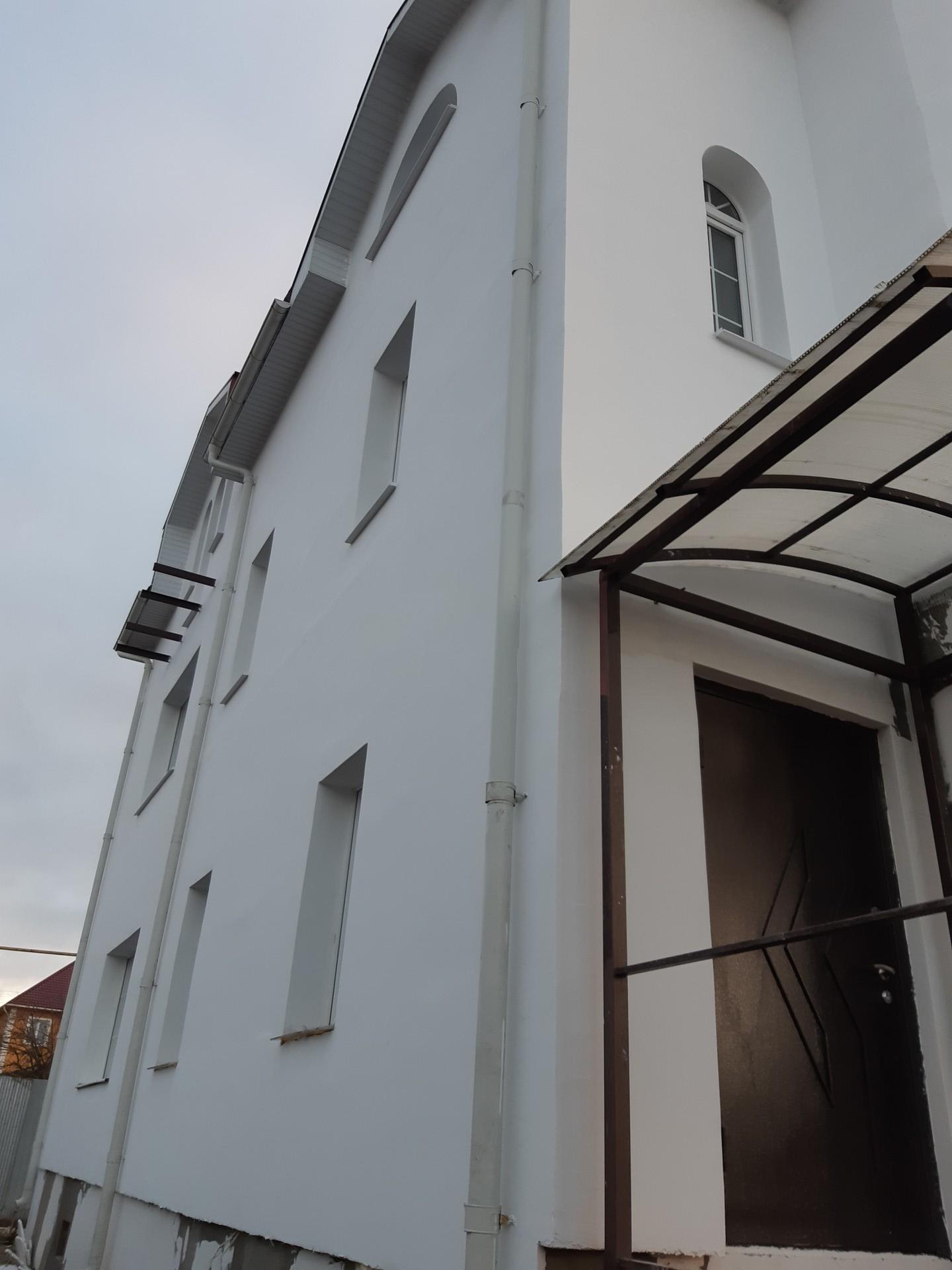 Стены коттеджа сложены из полнотелого керамического кирпича, толщина кладки внешних стен в 2,5 кирпича(~65см), внутренней несущей стены 2 кирпича(~50см), и внешние и внутренние стены дополнительно армированы кладочной сеткой . С внешней стороны стены коттеджа дополнительно утеплены (теплоизоляция 10см), оштукатурены и окрашены.